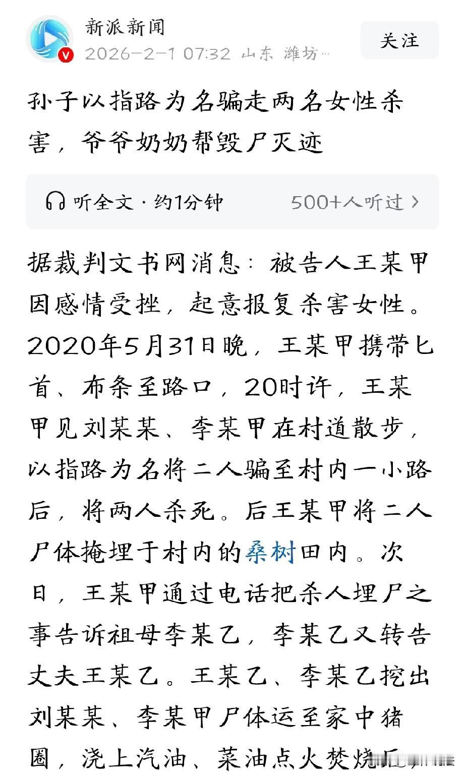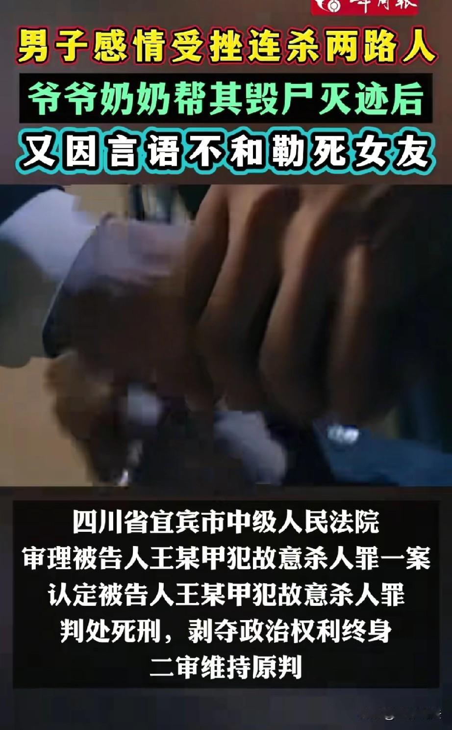丧心病狂!四川宜宾,00后小伙和女友吵架,内心不快,还产生了报复女性的想法。于是,他以指路为由,将两名女子骗到偏僻的小路上,残忍杀害并埋尸田里。事后他将此事告诉爷爷奶奶,老两口不但没有劝孙子赶紧自首,反倒将女子尸体挖出来焚尸毁迹。10天后,小伙再次作案,又在宾馆将17岁女友勒死,逃之夭夭。这下,等待他的将是法律的制裁。 2020年5月31日晚,天色已暗,00后王甲眼神凶狠,怀里揣着匕首和布条,在村口徘徊。 因为和女友吵架,他已经丧失了理智,满脑子都想着要报复女性,以解心头之气。 晚上八点多,女子刘某和李甲两人正晃晃悠悠的在村道上散步,王甲看到她们后,马上锁定她们为报复目标。 他脸上立刻堆起了虚伪的笑容,以指路为借口,将二人骗到一条僻静的小路。 当刘某和李甲毫无防备地跟着他走进小路后,王甲瞬间露出了狰狞的真面目,他抽出匕首,毫不犹豫地刺向两人。 两女子试图反抗,但根本不是王甲的对手,很快便倒在了血泊之中。 看着地上没了气息的两人,王甲没有丝毫害怕,他迅速将尸体拖到附近的桑树田里,用双手挖了一个土坑,将两人掩埋,然后,便像个没事人一样离开了。 次日,王甲才意识到害怕,他毕竟还年轻,一时不知道该如何处理后续的事情,于是,打电话给奶奶李老太求助。 李老太听到这个消息后,如遭雷击,过了许久才回过神来,将这个消息告诉了老板王大爷。 老两口吓得不轻,孙子平时确实游手好闲,不学无术,但他们怎么都没想到,他能干出这等荒唐事。 他们心里也清楚,一旦事情败露,孙子的一辈子就毁了,所以,他们并没有选择报警,而是决定帮王甲掩盖罪行。 当天夜里,老两口拿着铁锹,趁着夜色摸进了桑树田,开始挖尸,并硬着头皮将尸体运回了家中的猪圈。 回到猪圈后,老两口找来汽油和菜油,浇在尸体上,然后一把火点燃了火,彻底来个毁尸灭迹。 焚尸后,他们将部分残骸分别抛入了家门口的鱼塘和河内,王甲的罪行暂时被掩盖了过去。 谁知,他不仅没有收敛,很快又酿成大祸。 6月10日,王甲与17岁的女朋友凡某见面,谁知一见面,两人就因言语不和发生了口角,王甲心生怨恨,想要报复女友。 次日下午,两人再次相约在宾馆见面。一进房间,王甲就趁凡某不备,拿出事先准备好的布条,将凡某的双手反绑于身后。 凡某惊恐地挣扎着,但王甲却无动于衷,接着,他又用另一条布条狠狠地勒住凡某的颈部。 凡某的脸色逐渐变得苍白,身体不停地抽搐,但王甲的手却没有丝毫放松,直到凡某不再动弹,王甲才松开布条,逃离了现场。 很快,警方就接到了报案,经过侦查,很快锁定了嫌疑人王甲。 在铁证面前,王甲不得不承认自己的罪行。 《刑法》第232条规定规定:故意杀人的,处死刑、无期徒刑或者十年以上有期徒刑;情节较轻的,处三年以上十年以下有期徒刑。 法院审理明确,王甲因感情纠纷产生报复心理,以诱骗方式持刀杀害两名无辜女性,事后又在宾馆勒死17岁女友,连续剥夺三人生命,手段残忍,后果极其严重。 且作案后,伙同亲属埋尸、焚尸灭迹,毫无悔罪表现,完全符合故意杀人罪“情节特别严重”的法定情形。 综上,法院判决:王甲犯故意杀人罪,判处死刑,剥夺政治权利终身。 王甲不服一审判决,提出上诉,二审法院维持了原判。 年轻的小伙子因感情受挫就如此丧心病狂,杀害无辜生命,而他的爷爷奶奶不仅没有劝他自首,反而协助他毁尸灭迹,最终都受到了法律的制裁。 法网恢恢,疏而不漏,一定要遵纪守法,万不能触犯法律的底线。
