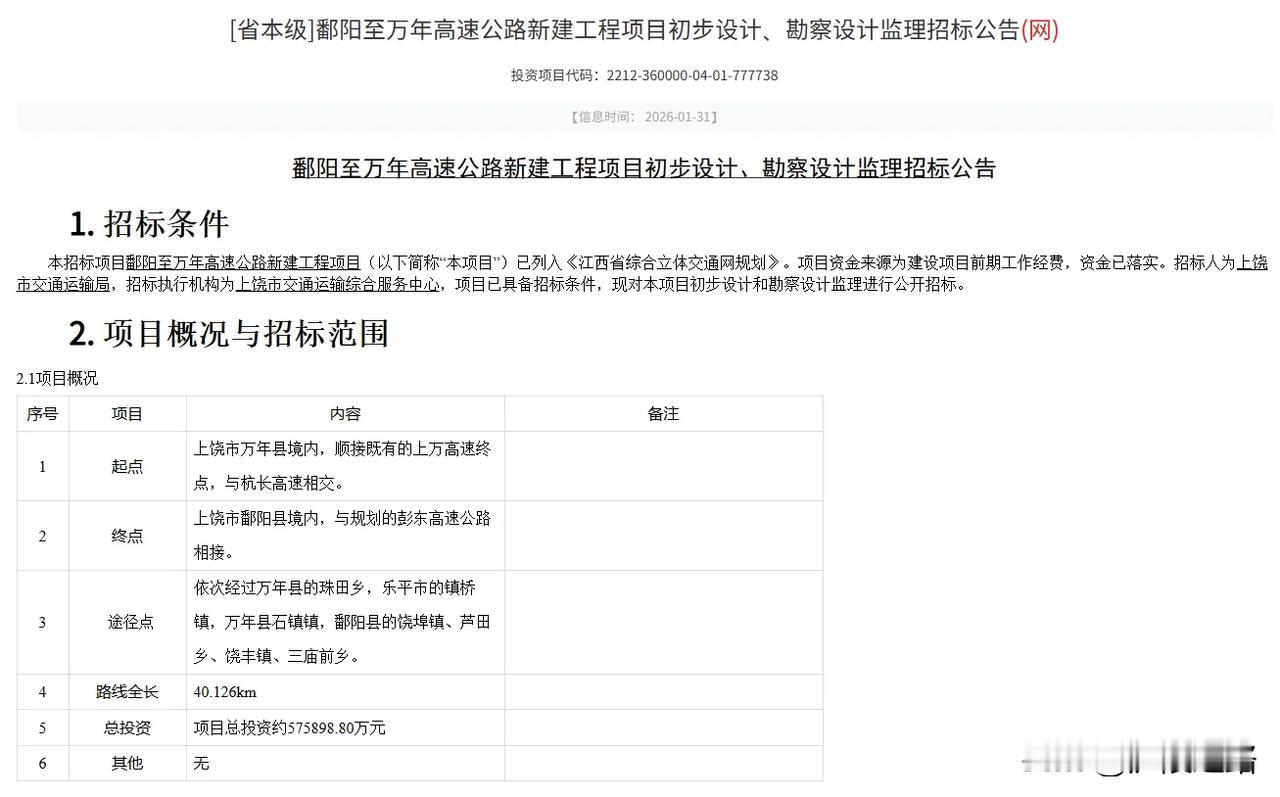 好消息,上饶市又一条高速公路新进展,鄱万高速公路初步设计招标公告 近日,鄱阳至万年高速公路新建工程项目发布初步设计、勘察设计监理招标公布。 本次招标划分为初步设计1个标段(PWCSJ),勘察设计监理1个标段(PWRSJ),投标文件递交的截止时间为2026年3月5日。 鄱阳至万年高速公路新建工程项目已列入《江西省综合立体交通网规划》。项目资金来源为建设项目前期工作经费,资金已落实,招标人为上饶市交通运输局。 总投资约57.59亿元,鄱万高速路线全长40.126km,其中万年县段长15.484km,乐平市段长0.478km,鄱阳县段长24.164km。 全线规划设置互通6处,其中3处枢纽互通,3处落地互通出入口。 鄱阳县:饶丰互通、饶埠互通。 万年县:石镇互通。