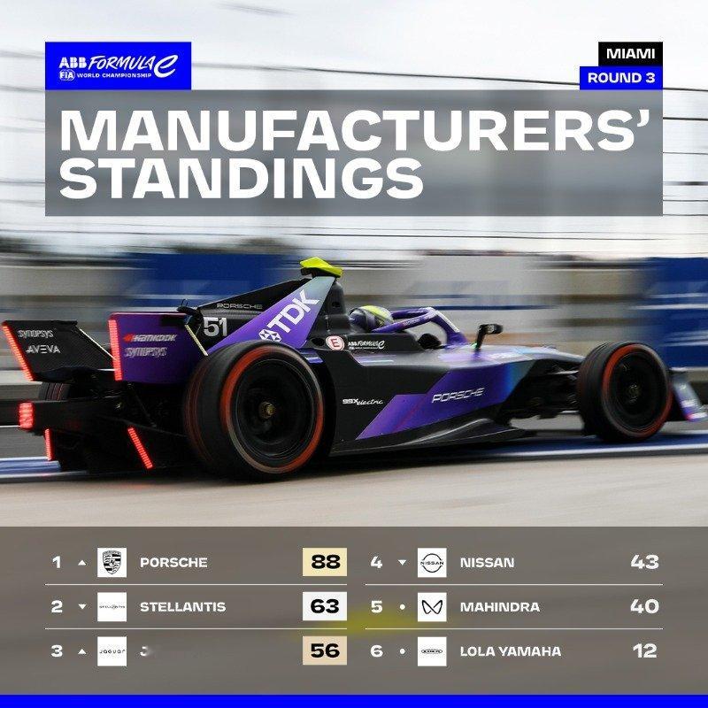 2026FE电动方程式迈阿密站 第三轮赛后的车队和制造商积分榜跟新。📊