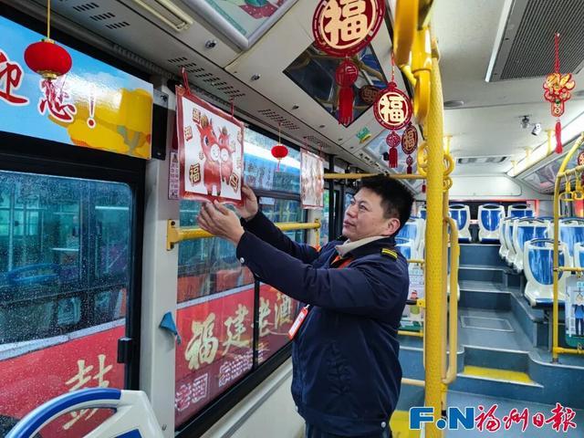 车厢内显示屏滚动播放着喜庆的“福”文化标识海报、“福马当先福启新程”主题宣传海报,车窗张贴“五福春运福通八闽”海报,车内布置“福”字窗花挂件。