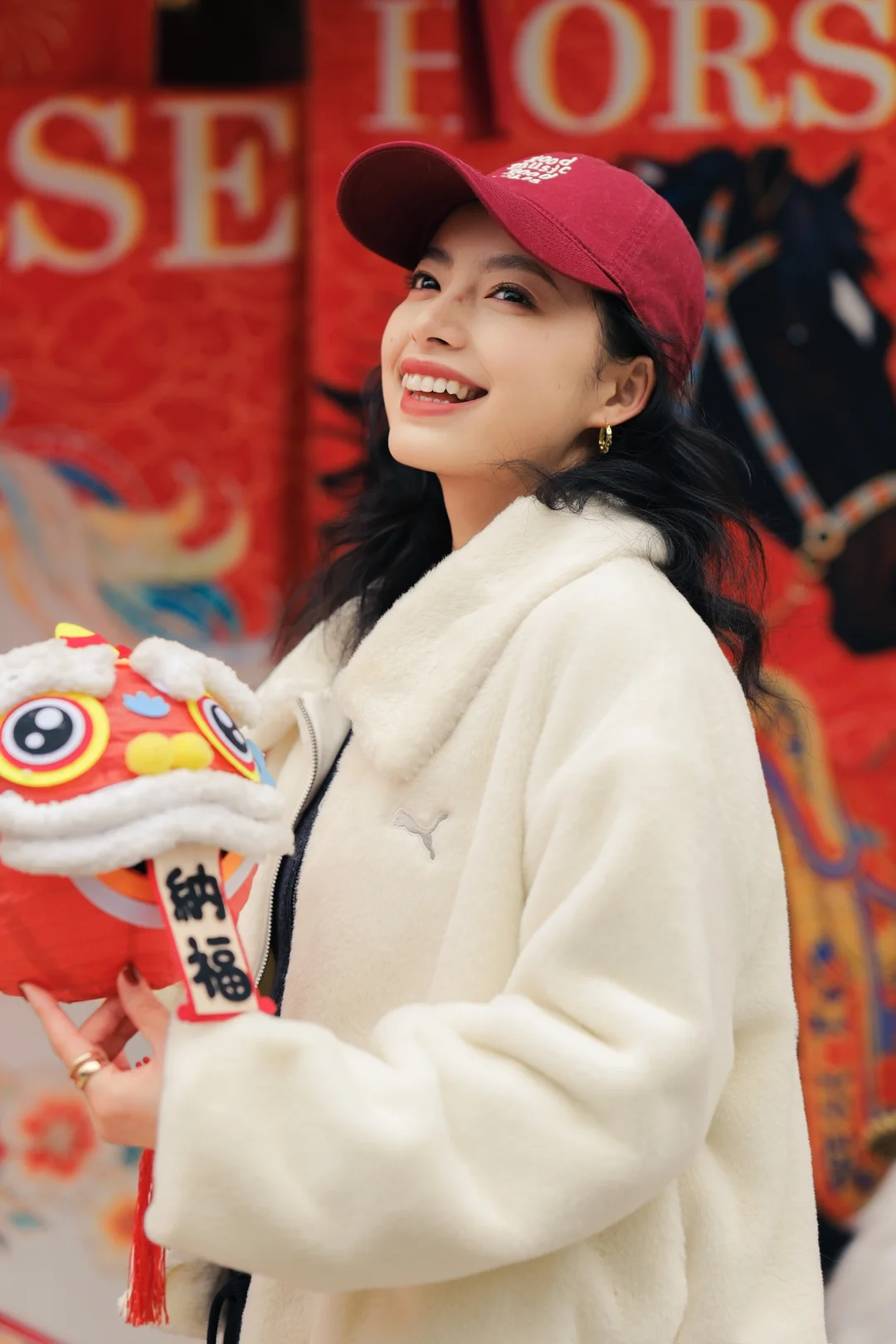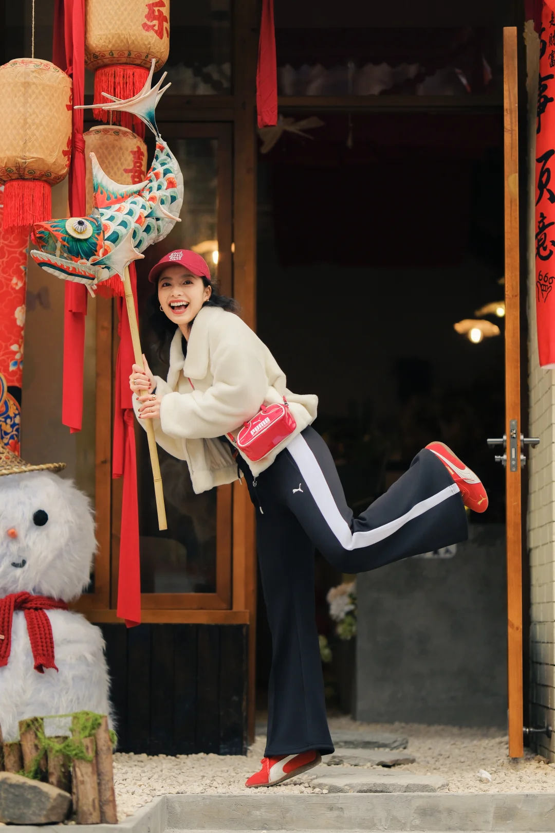 🔘单腿支撑手拿新春道具,,另一条腿向外轻抬,身体微微侧倾