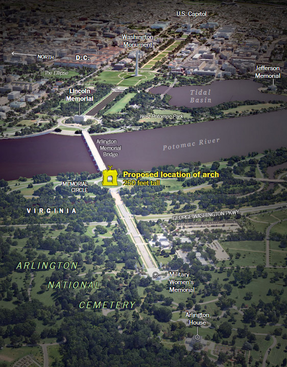 例如,美国建筑历史学家卡尔德·洛斯指出,一座76米高的巨型拱门,可能阻挡行人从华盛顿特区接近阿灵顿国家公墓时的视线。对于在阿灵顿国家公墓的游客,这样一座拱门可能阻挡他们眺望河对岸的林肯纪念堂和华盛顿特区的视野。