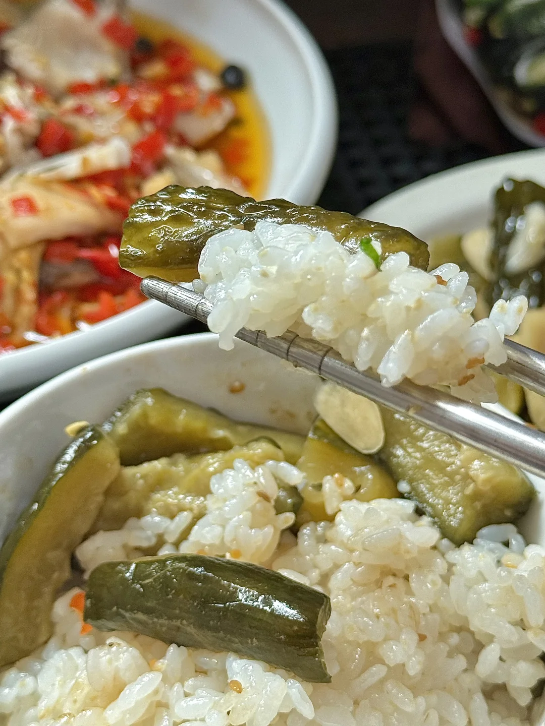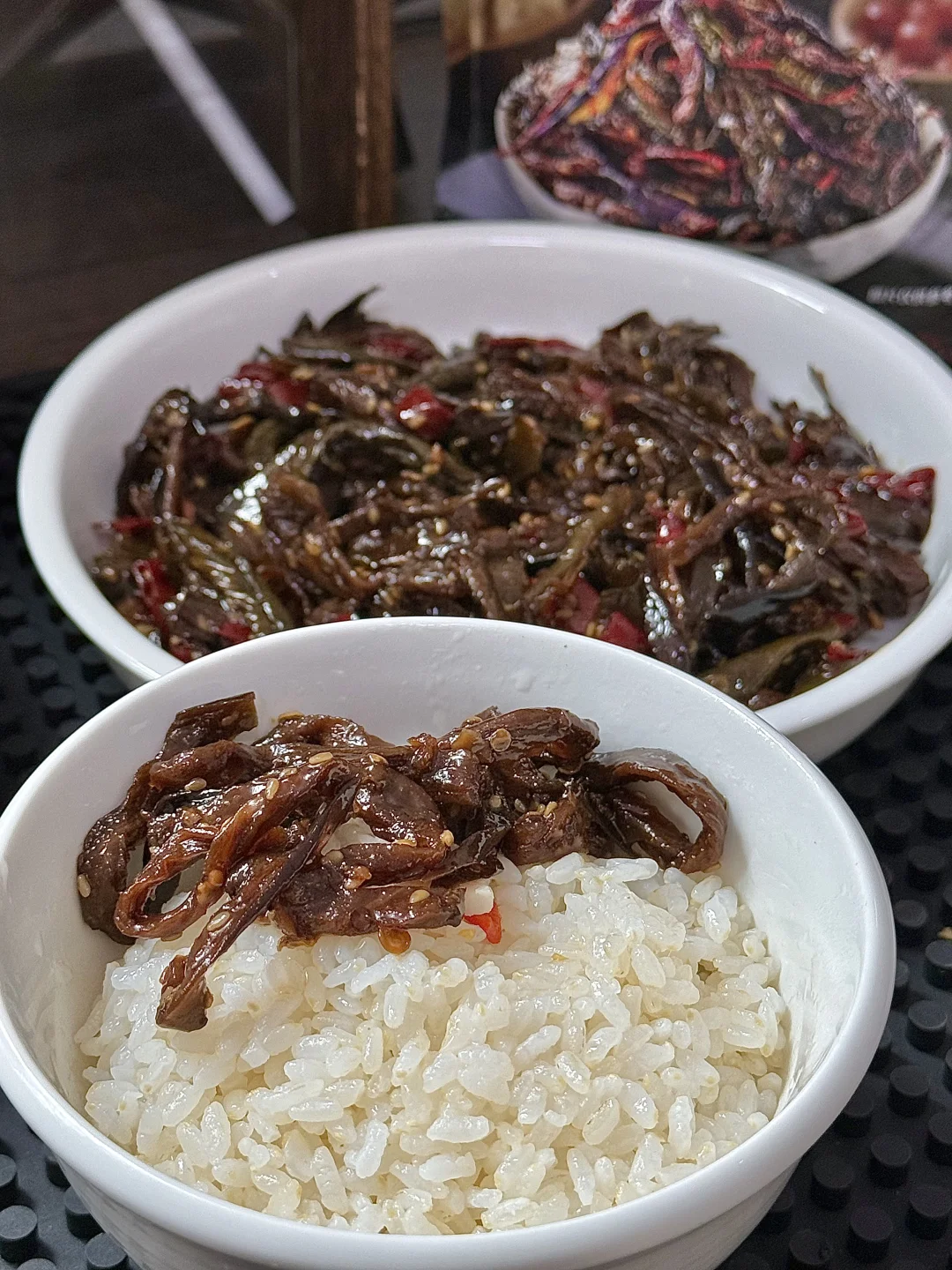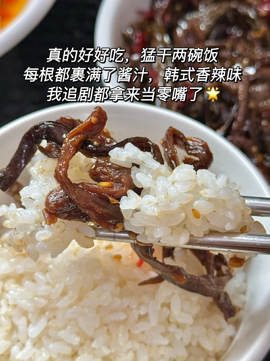 这玩意妥妥的干饭神器!茄子软嫩还带点韧劲,每一根都吸满了韩式香辣酱汁,油润但完全不腻,一点都不齁咸。一勺拌进白米饭里,瞬间就能炫完一碗,没胃口的时候来一口,直接打开食欲开关!