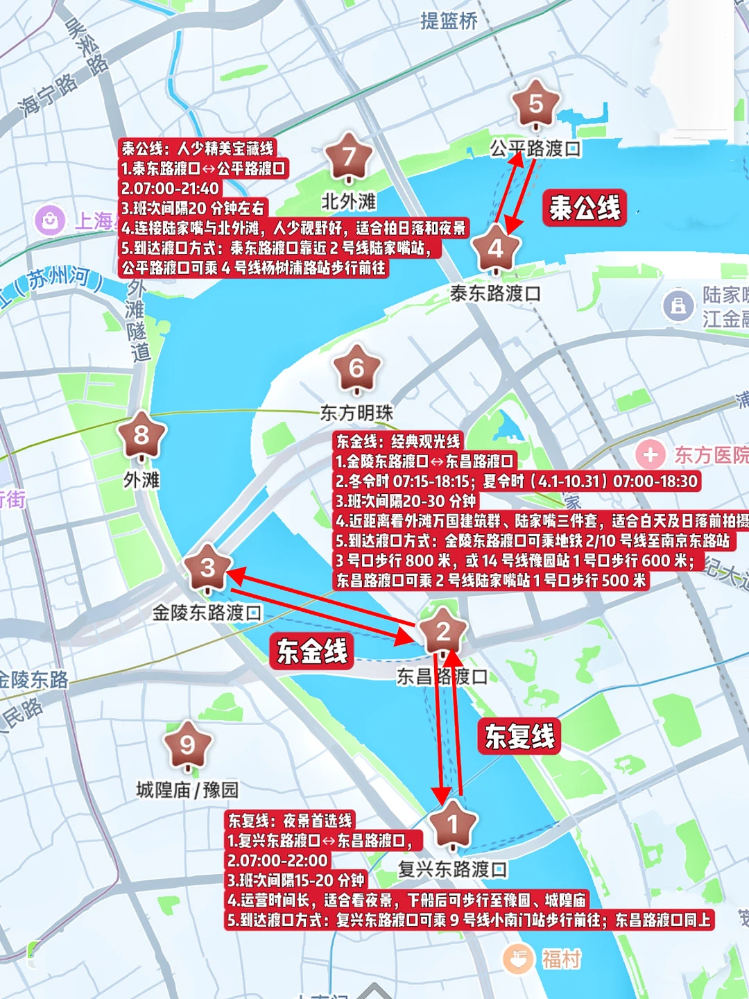 5、到达渡口方式:复兴东路渡口可乘 9 号线小南门站步行前往;东昌路渡口同上。