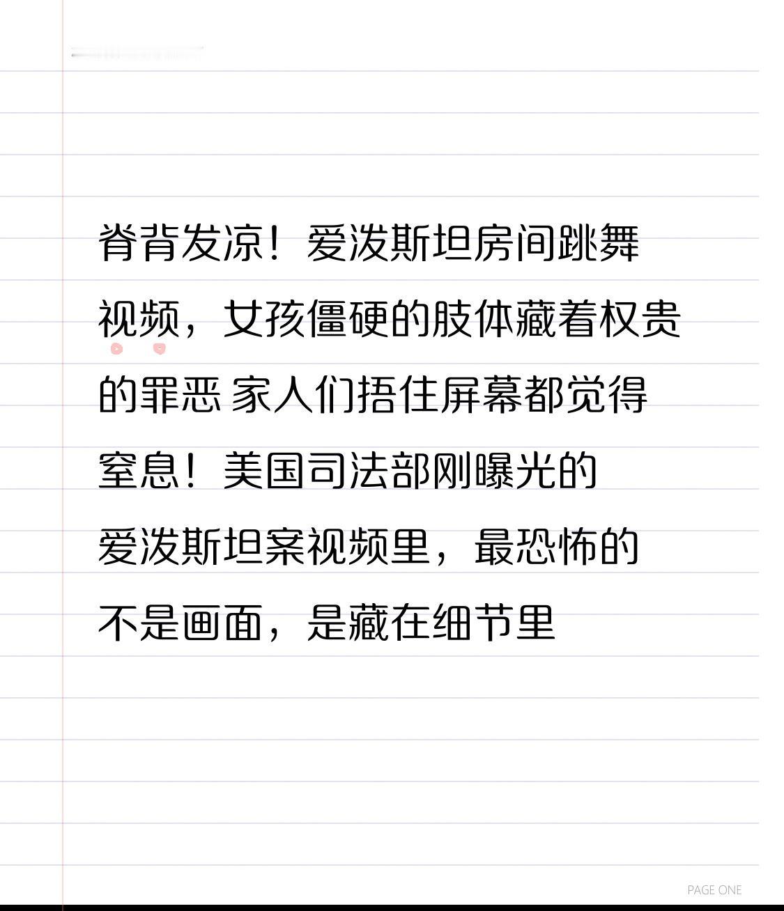脊背发凉!爱泼斯坦房间跳舞视频,女孩僵硬的肢体藏着权贵的罪恶 家人们捂住屏幕都觉得窒息!美国司法部刚曝光的爱泼斯坦案视频里,最恐怖的不是画面,是藏在细节里的绝望——豪宅房间内,他贴着女孩强行跳舞,手死死扣住对方腰肢,女孩身体绷得像块木板,眼神躲闪、脚步迟疑,而背景里传来的诡异笑声,比恐怖片配乐还让人毛骨悚然! 刚开始看这段视频,有人误以为是普通社交场景,可越扒细节越心惊!专家分析女孩的肢体语言全是应激反应:肩膀紧绷、手臂僵直贴在身侧,连呼吸都带着急促感,典型的“不敢反抗却满心恐惧”。更可怕的是,这段视频和厨房追逐片段被打包曝光,后者里女孩惊恐奔跑、他嬉笑着步步紧逼,两段画面连起来,分明是一场“狩猎式”的犯罪铺垫,被司法部直接定性为“性剥削的前置操控”! 本以为曝光视频是为了追责,没想到反转来得猝不及防!视频背后牵扯出的权贵名单,比舞蹈本身更暗黑:马斯克2012年的邮件里,主动追问爱泼斯坦“萝莉岛最狂野派对时间”,还强调“不要宁静的岛屿”,可现在却狡辩“多次拒绝登岛”;比尔·盖茨被曝邮件草稿里,承认和俄罗斯女孩发生关系后染病,向爱泼斯坦求助抗生素隐瞒妻子,转头就斥为“恶意诽谤”;英国安德鲁王子更实锤,不仅在爱泼斯坦定罪后仍与其频繁联系,还让对方介绍俄罗斯女子,甚至提议在白金汉宫秘密会面! 最讽刺的是,司法部一边大肆曝光受害者的痛苦视频,一边给真正的权贵遮丑。300万页文件堆起来堪比两座埃菲尔铁塔,可关键人物的名字全被涂黑,FBI提到的10名“共犯”,除了已定罪的吉丝兰·马克斯韦尔,其他人至今隐身。受害者集体发声控诉:“你们暴露了幸存者的隐私,却继续保护施暴的权贵”,这话戳中了无数人的痛点——视频里的女孩连面部都被模糊处理,可她们的恐惧被公之于众,而那些涉案的政商名流、王室成员,却能全身而退! 更让人寒心的是,这不是第一次“选择性透明”了。爱泼斯坦2008年靠秘密协议只坐13个月牢,2019年离奇“自杀”时,监狱监控“恰好”故障、狱警伪造记录。现在曝光这些跳舞视频,与其说是追求正义,不如说是转移视线——让大家骂爱泼斯坦这个死人,却忘了那些活着的帮凶和受益者。2000段视频、18万张照片,暴露的只是冰山一角,被隐藏的真相远比我们想象的更黑暗。 视频里的舞蹈终会结束,但受害者的创伤永远不会愈合;爱泼斯坦死了,但他构建的权贵犯罪网络还在。我们愤怒的从来不是一段诡异的舞蹈,而是法律对特权的纵容,是真相被刻意掩盖的无力。 屏幕前的你觉得,这些躲在阴影里的权贵,该被揪出来追责吗?点赞转发,让更多人看到这场“遮羞布式曝光”,我们要的不是八卦,是每个施暴者都付出代价,是正义不再向权力低头!你对哪个细节最震惊?评论区聊聊你的看法!