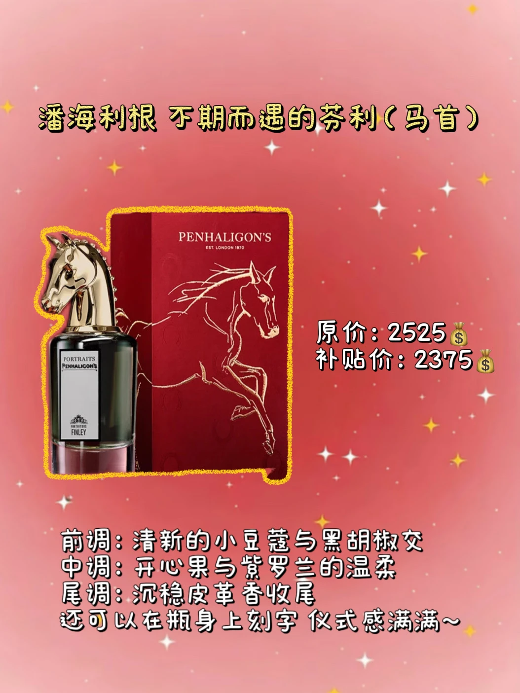 潘海利根这瓶马年香水味道真的很特别啊!香调是属于中性男女都可的木质调,前调是淡淡的开心果奶香,沉淀过后是高级沉稳的皮革香,是属于越闻越上头的一款香水!马年必须安排上一只给老公,喷了“马香”,新的一年都能马到成功!