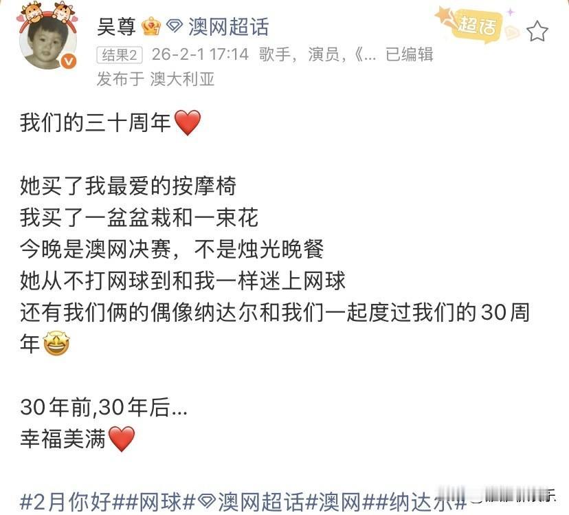 吴尊高调发文:不一样的三十周年。 2月1日,吴尊在社交平台发文,让网友们吃了一大口狗粮,他说: “我们的三十周年,没有烛光晚餐,老婆买了我最爱的按摩椅,我买了一个盆栽和一束花,今晚是澳网的决赛,她从不打网球到和我一样迷恋上网球,我们还和我们的偶像纳达尔拍了合照,我们和他一起度过了我们的三十周年,不管是三十年前还是三十年后,我们都幸福美满。” 他还配了六张图片,分别是三十年前的他们和三十年后的他们,还有他们夫妻俩和纳达尔的合照。 不管是字里行间还是合照中,都洋溢着幸福。 吴尊和老婆相恋于16岁,两人有一儿一女。 他应该是娱乐圈里又长得帅,又专一的好男人。 他的三观真的好正,他曾在节目里说: “在我的世界里,我的爱人永远排在第一位,因为有她才有家,其次是我的孩子,因为他们是我的未来,第三是我的父母,我希望以后,我的孩子也像我一样这样排序。” 之前何猷君也说过,自己的小家永远是排在第一位的,这和吴尊的说法很契合。 这也是吴尊三十多年来,和妻子林丽吟保鲜的秘诀,任何事情把妻子放在第一位,两个人的感情怎么可能不好呢? 当代社会中的很多男人,都应该和吴尊好好学学,不管是什么时候,都应该把自己的老婆放在第一位,而不是一有事,先给老婆找麻烦。