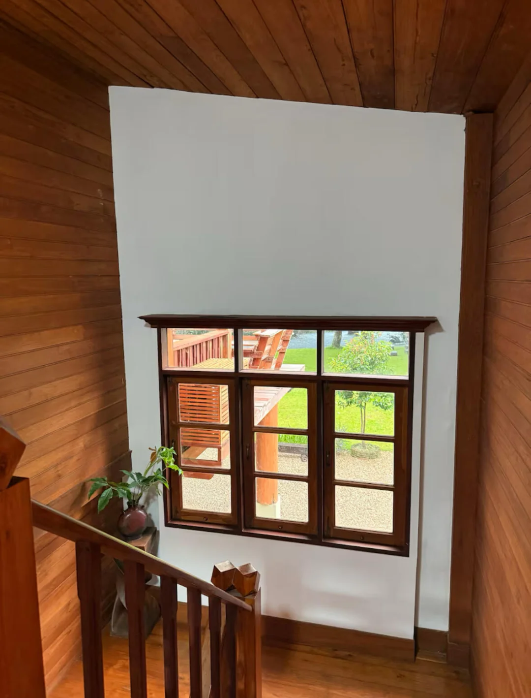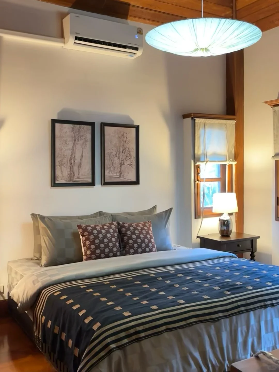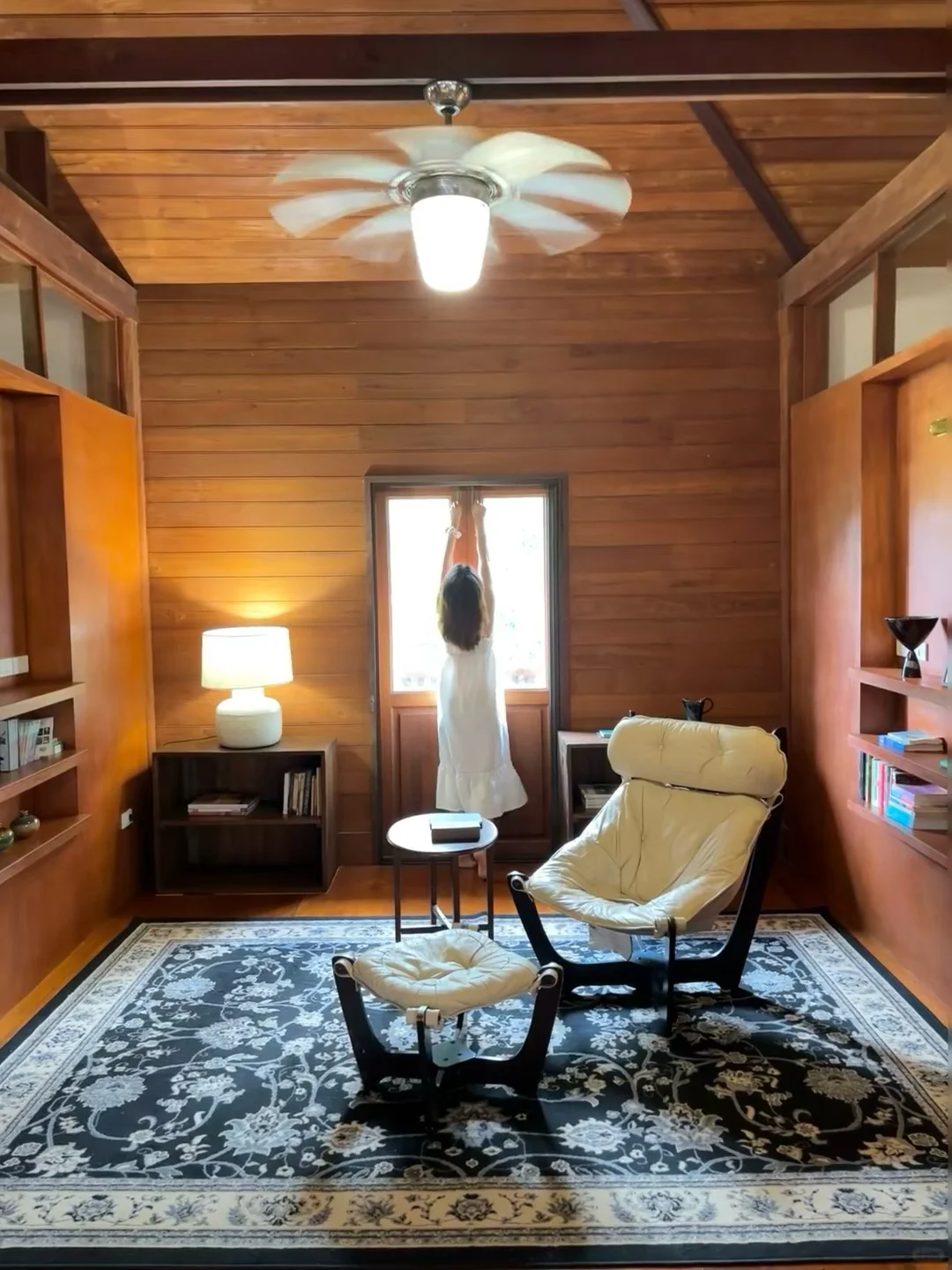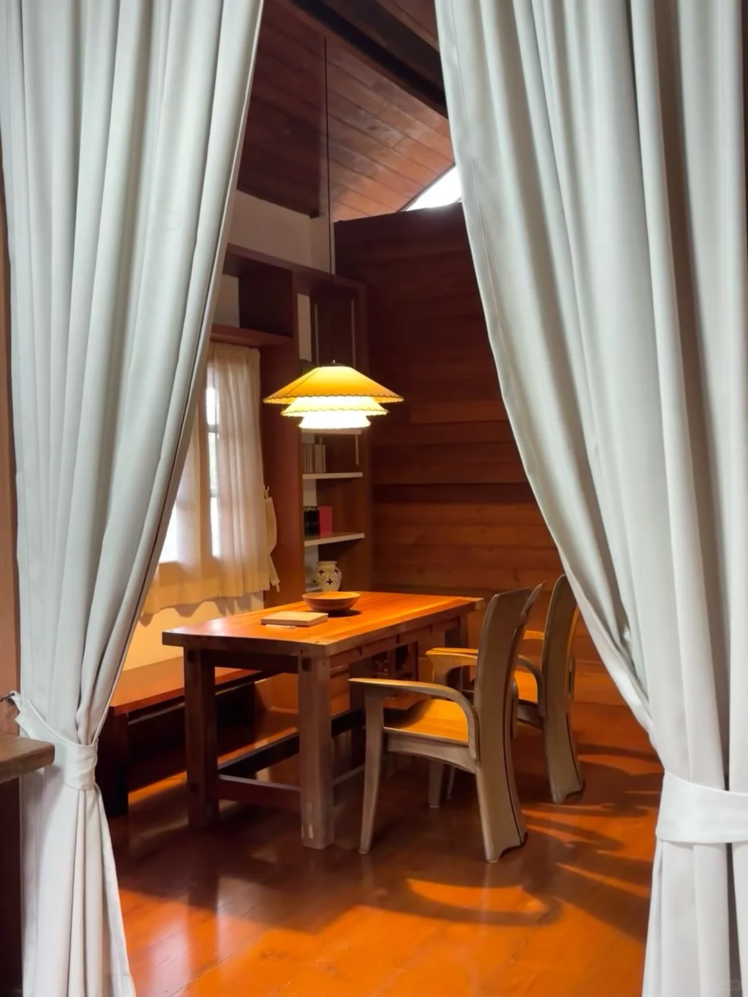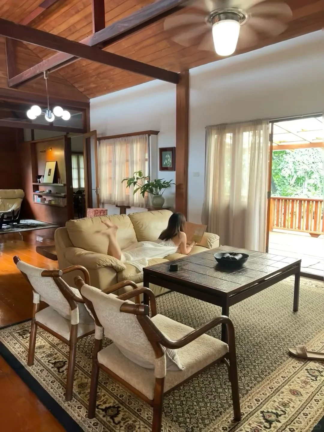 🍃房子是独栋的双层木屋,传统泰式建筑,布置的特别温馨,有花纹很好看的地毯,纯白色的帷幔,点缀的恰到好处的绿植,摆件和家具也都超有品味