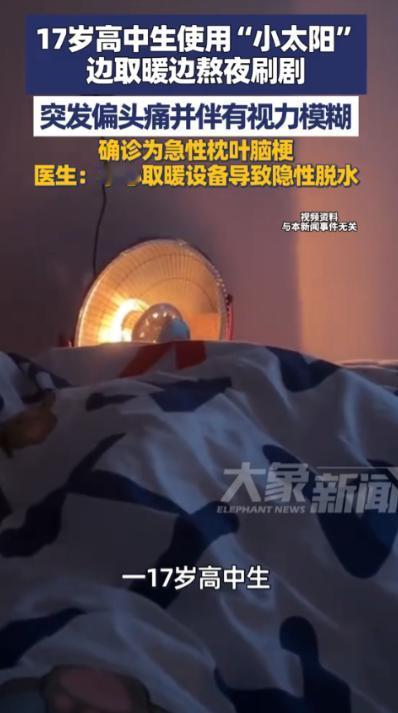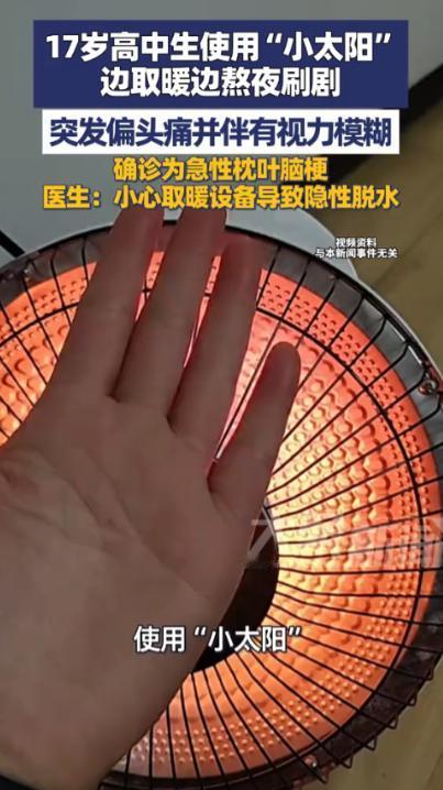 “悲剧还是发生了!”1月29日,福建,一17岁高中生为了暖和点熬夜刷剧,把小太阳放在身边烤了好几个小时,结果突然开始头痛欲裂,看东西一片模糊,家人赶紧送医,最终诊断为急性枕叶脑梗。网友:烤小太阳怎么就能引发急性脑梗呢? 据福建综合频道第一帮帮团报道,这名高中生趁着假期放松,夜里裹着被子熬夜刷剧,因为天气湿冷,就把小太阳放在身边,近距离烘烤了好几个小时,全程只顾着看剧,没起身活动,也没及时喝水。 深夜里,悲剧突然发生,这名高中生突然感到头痛欲裂,眼前的屏幕瞬间变得模糊,连东西都看不清,还出现了右侧肢体麻木无力的情况,连手机都握不住。 家人听到动静后赶紧赶到,看到他痛苦的模样,立刻送他前往医院急诊,经过检查,最终被确诊为急性枕叶脑梗,这个多见于中老年人的疾病,竟出现在了17岁少年身上。 事件传开后,不少网友疑惑,烤小太阳怎么会引发急性枕叶脑梗,接诊医生给出了明确解释,这并不是单一因素导致的,而是多种风险叠加的结果。 最主要的原因是长时间近距离用小太阳烘烤,会加速人体表面水分蒸发,加上密闭卧室环境和没及时补水,身体会陷入隐性脱水状态。 这种脱水没有明显出汗症状,很容易被忽视,隐性脱水会让血液变得黏稠,流速变慢,容易形成血栓。 再加上这名高中生熬夜刷剧,身体处于应激状态,血管收缩异常,久坐不动又让血液流速进一步减慢,三重因素叠加,最终导致血栓堵塞脑部枕叶血管,引发急性枕叶脑梗,枕叶是大脑的视觉中枢,所以他最先出现了视力模糊的症状。 医生特别提醒,冬季用小太阳等取暖设备时,千万别近距离直烤头颈部,要保持安全距离,也不要整夜开启,同时要主动补水,别等口渴了再喝,避免隐性脱水。 年轻人也别忽视不良生活习惯的危害,熬夜、久坐都可能给血管带来负担,别让一时的放松,酿成无法挽回的悲剧。 以上都是个人观点,对此您有什么不同的看法,可以在评论区留言讨论!!!
