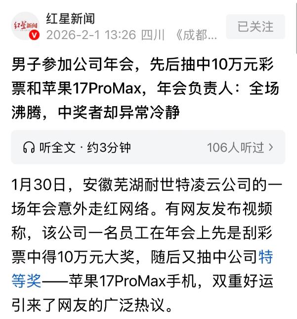 “运气来了,挡都挡不住!”安徽芜湖,男子参加公司年会抽奖,他先抽中10万彩票,转头又抽中万元苹果手机,这下全场沸腾,所有人都看傻眼,男子却云淡风轻,波澜不惊。网友:公司还招人吗? 1月30号,安徽芜湖耐世特凌云公司举办年会,现场来了不少员工,大家都等着参与抽奖、领取福利,氛围特别热闹。 这次公司给每位到场员工都准备了一张彩票当福利,本来大家都没抱太大期望,觉得就是图个乐子。 公司的老员工朱先生,是一名一线员工,平时在公司踏实干活,当天也和其他同事一样,拿到彩票后慢慢刮开。 刮完之后,他自己都没敢相信,反复确认了好几遍,才赶紧叫来了公司年会负责人胡先生帮忙核实,原来他中了10万大奖。 这事儿一传开,现场瞬间就热闹起来,同事们都围过来,又惊又羡,可朱先生却没什么夸张的反应,只是安安静静待在原地,等着确认领奖的相关事宜。 据了解,这笔奖金扣除税费后,实际到手的会少一些,他也全程保持平静,没有丝毫狂喜的模样。 更巧的还在后面,年会进入特等奖抽奖环节,特等奖是万元苹果手机,公司总经理觉得朱先生运气特别好,就特意邀请他上台,让他帮忙抽取特等奖,想着让他把好运气传递下去。 朱先生上台后,随手从抽奖箱里抽了一张奖券,慢慢展开查看,念出名字的时候,连他自己都愣了一下——竟然抽中了自己。 这下,现场彻底沸腾了,所有人都看傻眼,大家纷纷鼓掌欢呼,还有人拿出手机记录下这个罕见的时刻,就连现场拍摄年会的商拍摄影师,都觉得这运气太难得。 面对接连到来的双重大奖,朱先生依旧云淡风轻、波澜不惊,没有说太多话,只是简单鞠躬致谢,全程都很淡定。 事后公司负责人也明确表示,整个抽奖过程没有任何暗箱操作,全靠纯运气。 这件事传到网上后,很快引发了网友热议,大家都羡慕朱先生的好运气,还有不少网友调侃着追问,这家公司还招人吗,也想沾沾好运。 其实这份好运,不仅是偶然,也让大家看到了这家公司对员工的用心,每年都会用心准备年会福利,给员工带来惊喜。 以上都是个人观点,对此您有什么不同的看法,可以在评论区留言讨论!!!