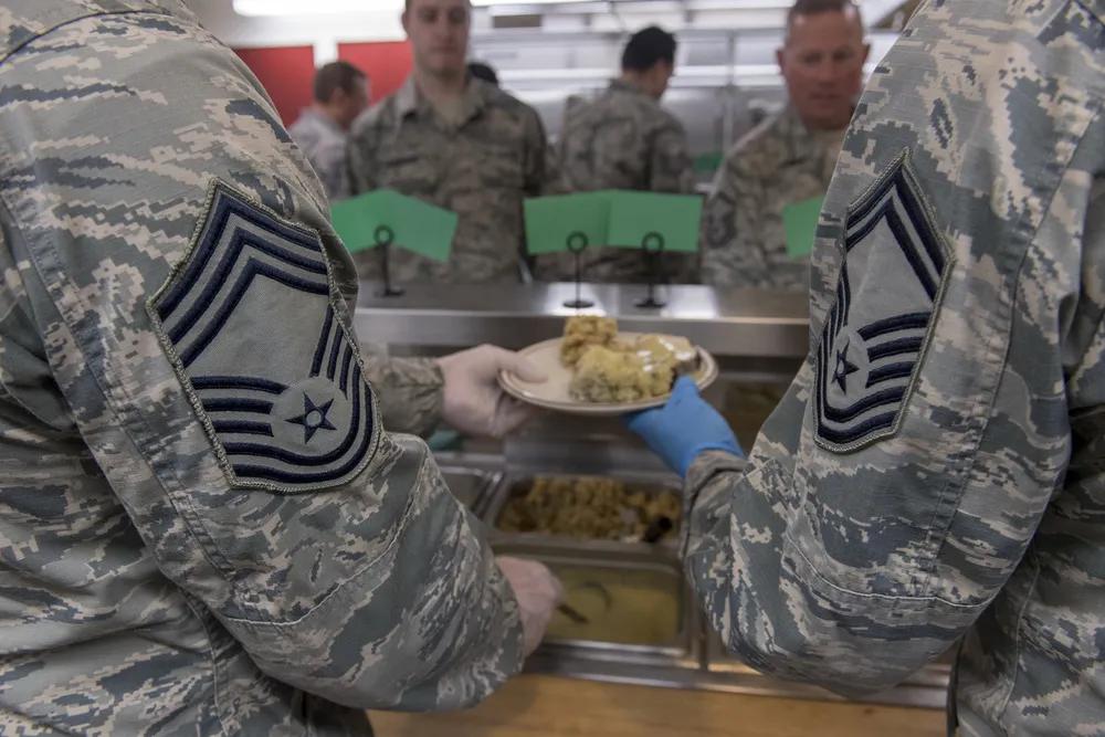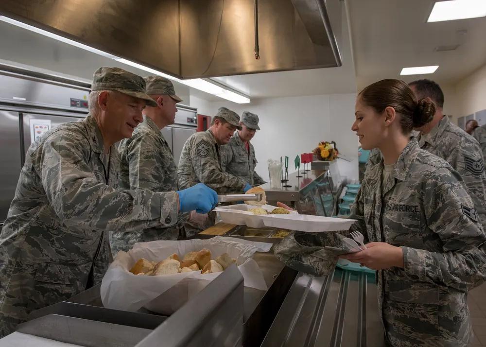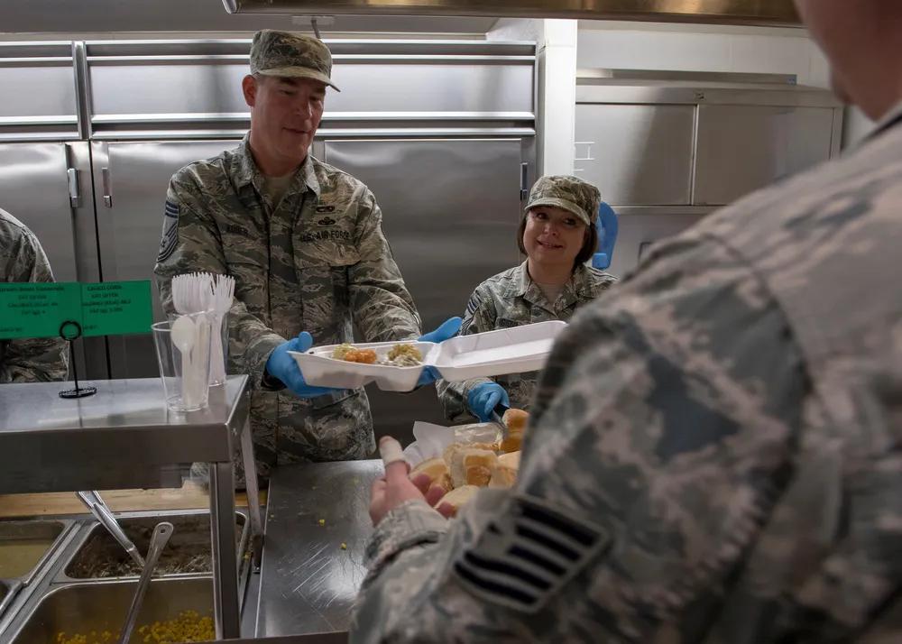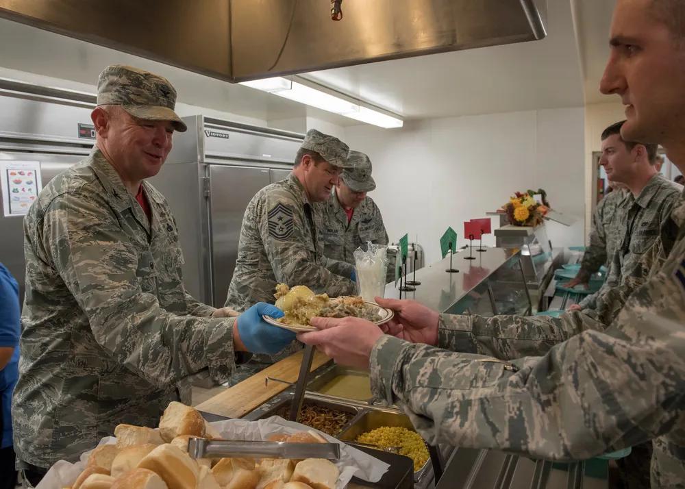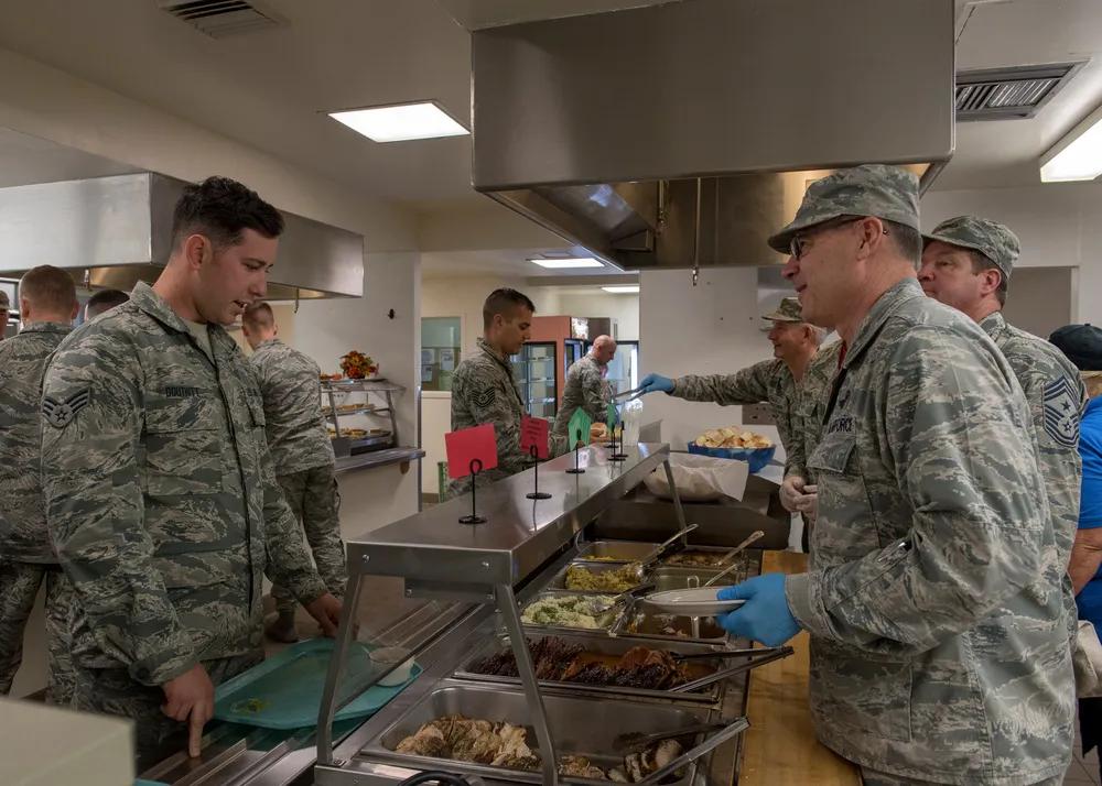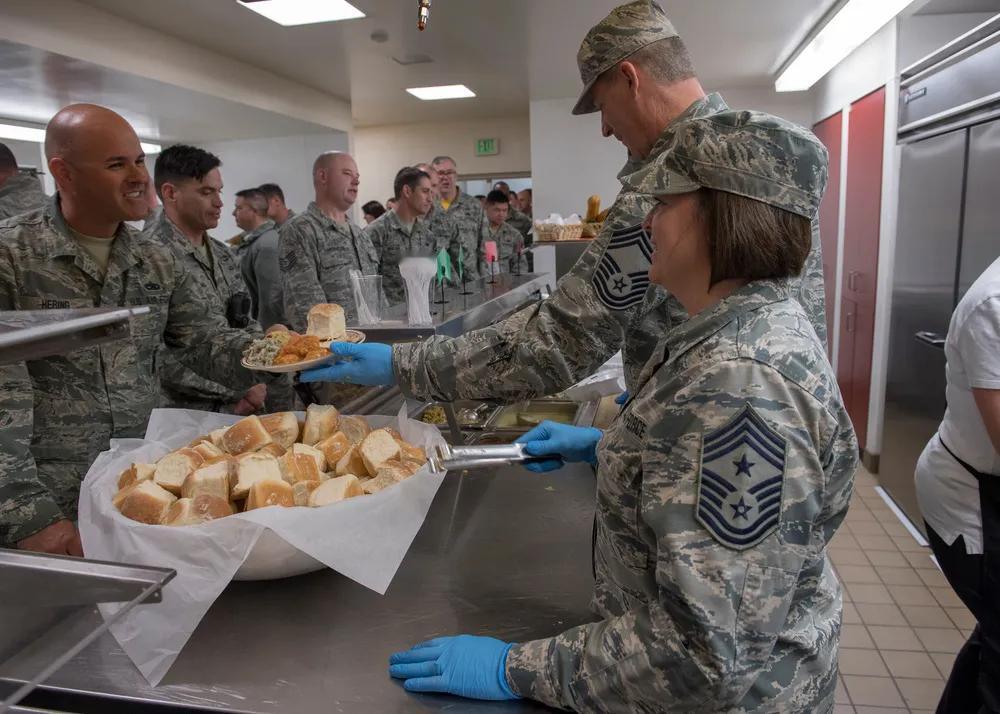 美军给士兵提供餐食一律是面包🍞,没有米饭🍚,面条🍜之类,当然少不了“预制菜”。 美国爱达荷州空军基地高级领导于在爱达荷州博伊西高文机场第124战斗机联队餐厅为空军士兵提供节日晚餐。
