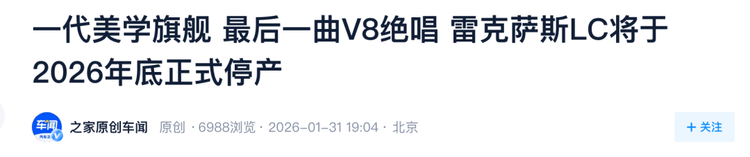 据媒体报道,雷克萨斯LC500车型将于2026年底正式停产,而500h混动版车型已于去年正式停产。据称,其替代车型将于2030年左右推出,可能与下一代丰田GRSUPRA基于相同的平台打造。