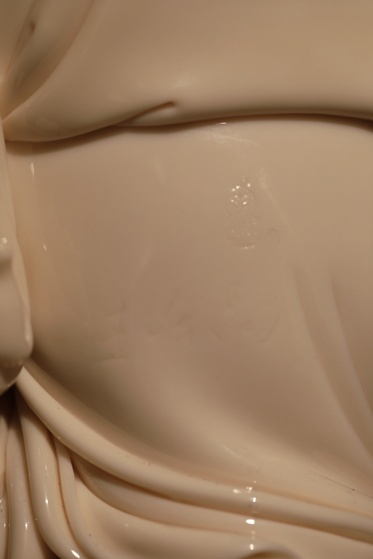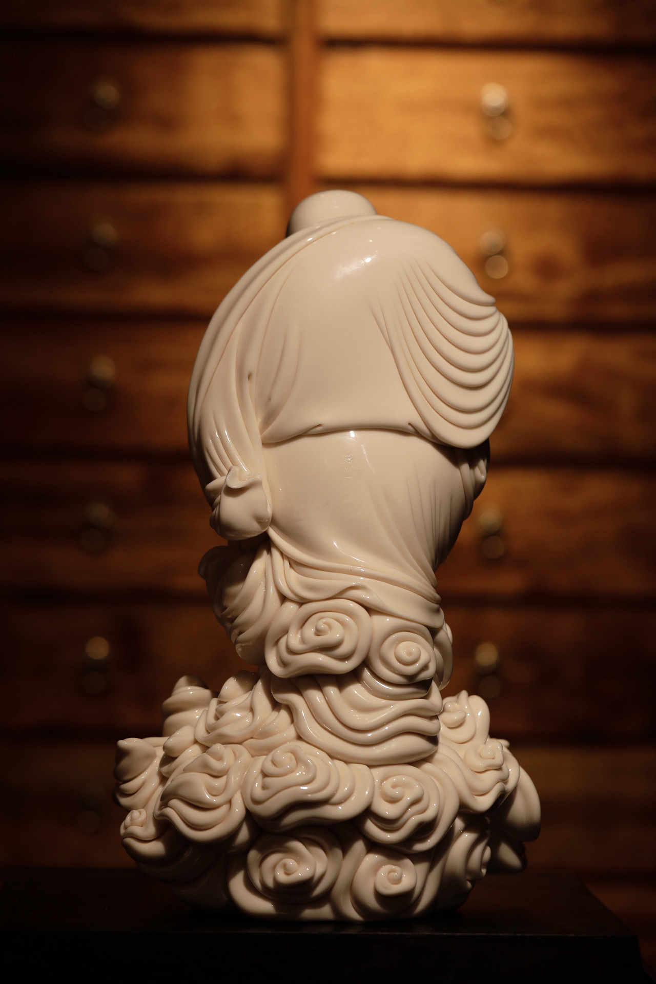 大师李璋高作品,本品取德化顶级高白瓷泥,经大师手塑高温烧成。弥勒佛踏层叠祥云而行,身形圆融饱满,开怀畅笑,动态鲜活。其左手高持小如意,如意之上,一只蝙蝠翩然栖落,构成“福(蝠)在眼前”之妙趣。衣袂迎风飘举,与脚下翻涌的祥云气韵贯通,将“步步生莲(云)”之动感与欢喜自在之神态刻画得淋漓尽致。