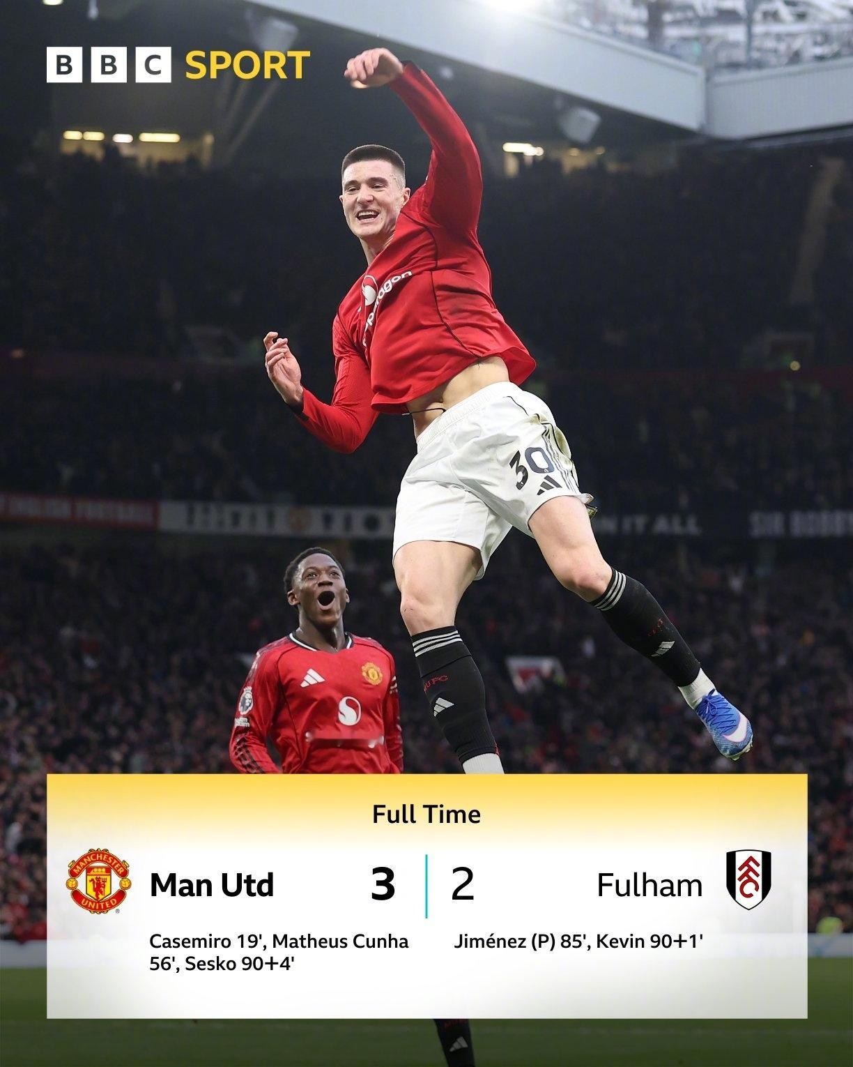 英超第24轮,曼联凭借塞斯科在补时第4分钟的进球3-2绝杀富勒姆,卡里克上任后球