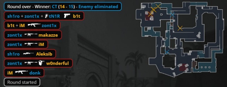 第28回合攻守互换,donk架拱门先杀iM再杀小李子,zont1x站住VIP门口也轰出双杀,sh1ro轰掉b1t,双方14-14。