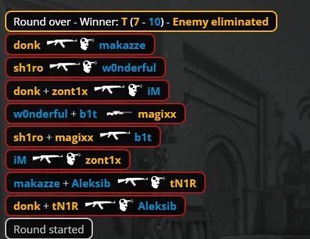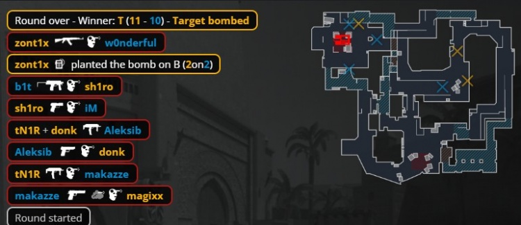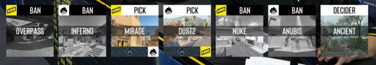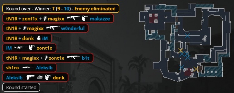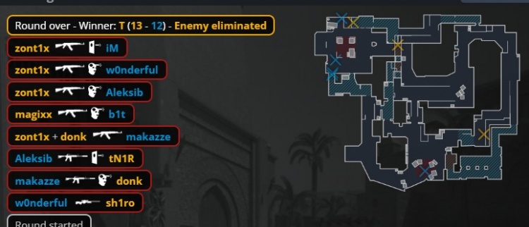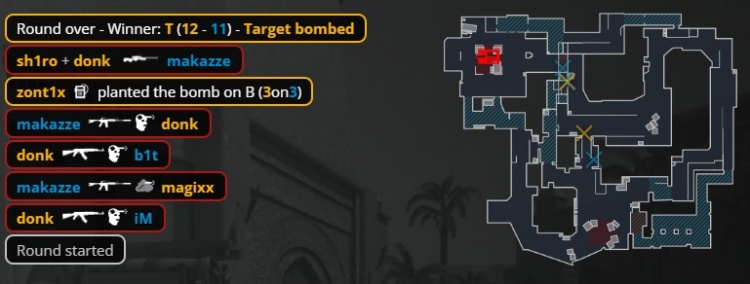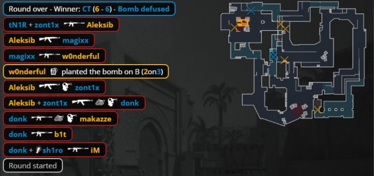 最终donk下水道先杀iM,随后donk回A轰掉A二楼b1t,再喊队友炸烟换掉VIP楼下的makazze,小李子拱门双杀,wonderful进B下包后被magixx击杀,小李子残局1v3无力回天,双方6-6战平。