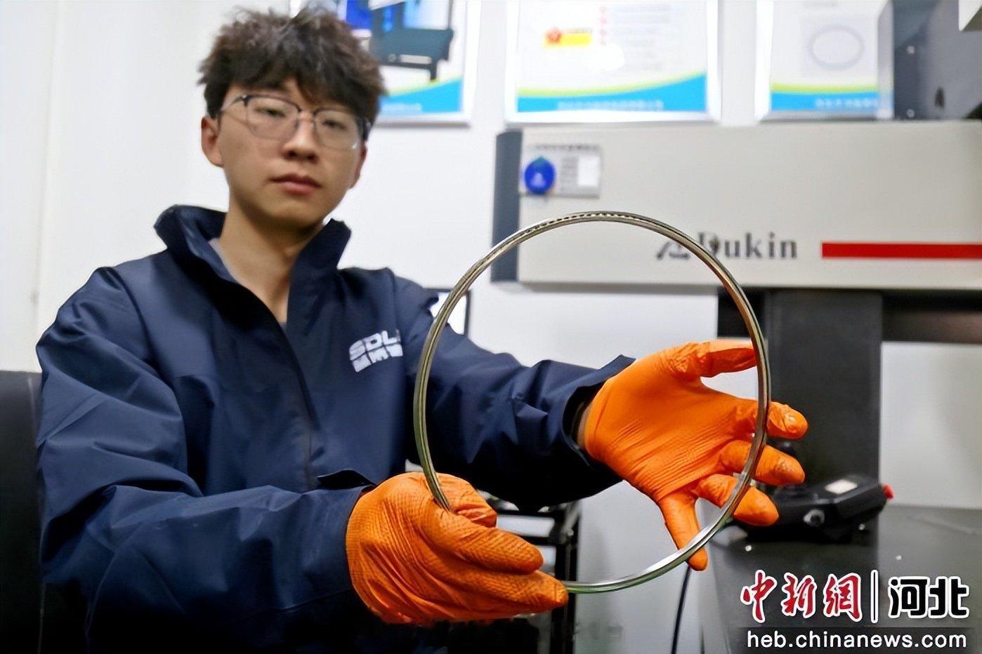 图为在馆陶县一家轴承生产企业实验室,检测人员展示薄壁等截面轴承。郭江鹏摄