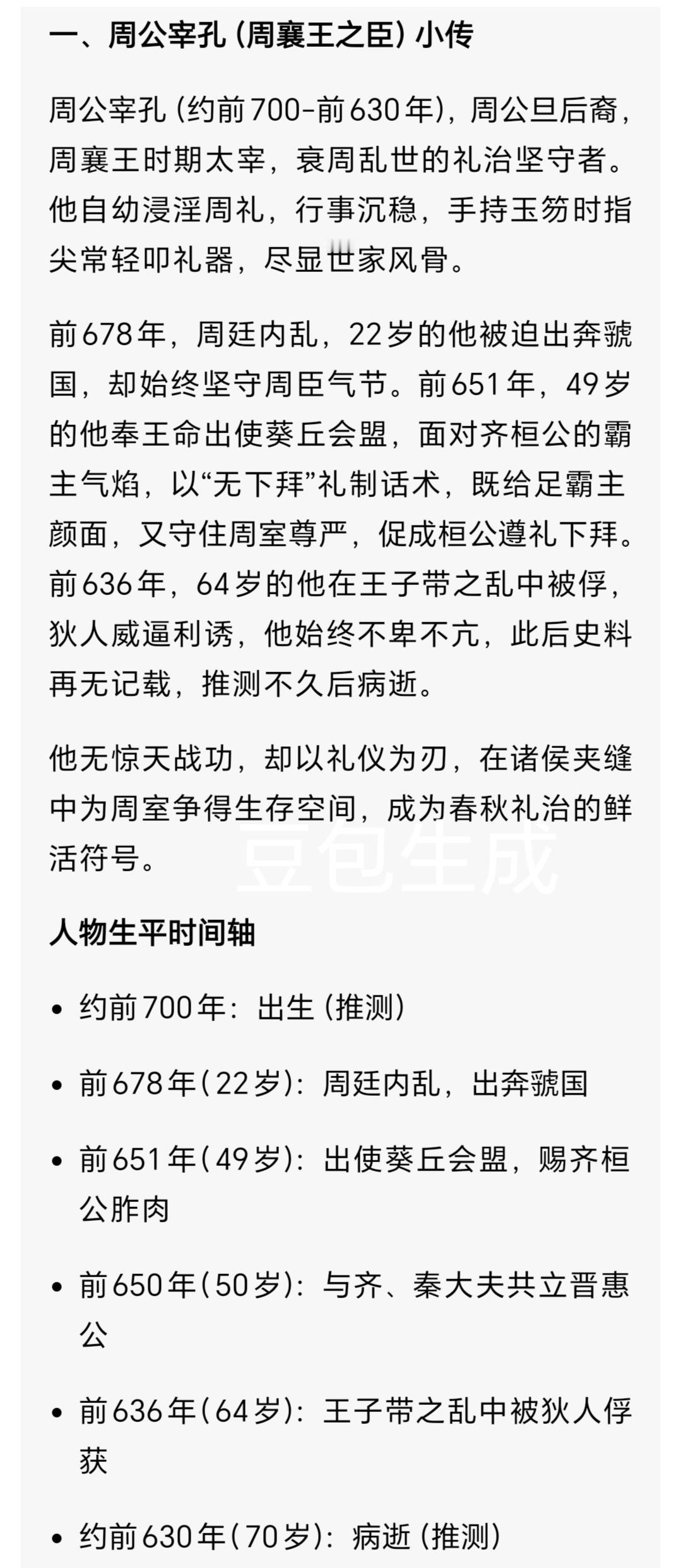 衰周无兵无地 宰孔何以凭一言让齐桓公跪拜?守礼者的智慧 春秋乱世,诸侯挥戈抢地盘,周王室只剩百里之地苟延残喘。可一位周臣不带一兵一卒,仅凭几句周礼说辞,就让称霸诸侯的齐桓公乖乖下拜——他就是周公宰孔,衰周乱世里最硬核的“礼治代言人”,用一生诠释了“弱国无外交,却可凭礼立身处世”。 一、葵丘盟坛:三尺礼器镇住霸主锋芒 公元前651年的葵丘,旌旗遮天蔽日,齐桓公召集鲁、宋、卫等诸侯会盟,坛上青铜礼器熠熠生辉,坛下甲士肃立如林。此时的齐国“九合诸侯,一匡天下”,齐桓公身着绣龙锦袍,接受诸侯朝拜,俨然天下共主。 宰孔就是在这样的气场中登场的。他身着周室标准的玄端礼服,腰间佩着青玉琮(cóng),手持用锦缎包裹的祭肉(胙zuò),步履沉稳不疾不徐。作为周公旦的后裔,他自幼浸淫周礼,举手投足都透着刻在骨子里的礼仪规范,即便面对满坛的霸主气焰,眼神也未曾有半分闪躲。 “天子使宰孔赐齐侯胙!”传令官的声音刚落,齐桓公便要登坛受赏。宰孔上前一步,声音清朗却掷地有声:“襄王有言,齐侯劳苦功高,尊为伯舅,受胙时可无下拜之礼。”这话像一块石头投进沸水,诸侯哗然——按周礼,诸侯见周使需三拜九叩,如此殊礼简直是默认齐桓公的霸主地位。 齐桓公捋着胡须面露喜色,正要应下,身旁的管仲悄悄拽了拽他的衣袖:“君侯不可!忘礼则失天下心,周室虽弱,天命仍在。”桓公猛然惊醒,转身对着宰孔深深下拜:“臣不敢僭(jiàn)越,必遵周礼受赏。” 那一刻,宰孔手持胙肉的手指微微收紧,眼底闪过一丝欣慰。他知道,这一拜不是拜周室的兵力,而是拜周礼延续数百年的规矩。坛上的青铜鼎彝(yí)仿佛都在低语,见证着弱国使臣用礼仪守住的最后尊严。 二、乱世谋身:不是迂腐是清醒的生存智慧 宰孔能在衰周朝堂立足数十年,绝非仅凭出身和礼仪。《左传》中零星记载的细节,拼凑出他“外守礼、内务实”的生存哲学。 他出身周公世家,自幼在洛邑的宗庙中耳濡目染,对礼乐制度烂熟于心,但从未沦为死守教条的腐儒。周襄王即位之初,王室财政匮乏,连祭祀的牛羊都凑不齐,有大臣提议削减诸侯朝贡的礼仪规格,宰孔却坚决反对:“礼者,周室之根也。根在,即便枝繁叶茂被夺,仍有复苏之机;根亡,则王室彻底沦为诸侯附庸。” 他提议“减仪不减礼”——简化朝贡流程,却保留核心礼仪:诸侯使者必须按规制入太庙、献玉帛、行叩拜礼。看似微不足道的坚持,却让诸侯始终记得“天下共主”的名分,为周室争取了喘息空间。 更难得的是他的审时度势。公元前636年,王子带勾结狄人作乱,襄王被迫出逃郑国。满朝大臣要么主张硬拼,要么建议投靠晋国,宰孔却力排众议:“硬拼则国亡,投靠则失主。不如遣使晓谕晋、秦,以周礼责之‘勤王’,既保王室体面,又借诸侯之力平乱。” 他亲自出使晋国,面见晋文公时,不卑不亢地陈述:“王室内乱,诸侯有责。晋侯若能勤王,周室将以河内之地为谢,更可借天命之名号令诸侯。”这番话既点出利益,又扣住“尊王攘夷”的大义,精准击中晋文公称霸的野心,最终促成晋国出兵平乱。 说实话,在那个“强权即真理”的时代,宰孔的每一步都如履薄冰。他不像管仲那样富国强兵,也不像晏婴那样巧言善辩,却凭着对周礼的深刻理解,在诸侯争霸的夹缝中,为周室争取到了最大限度的生存空间。 三、礼之底色:乱世中最珍贵的坚守与清醒 宰孔的一生,没有惊天动地的战功,也没有纵横捭阖的谋略,却在《史记·周本纪》《左传》的寥寥数语中,成为春秋礼治的鲜活符号。他的坚守,藏着超越时代的清醒。 他深知周礼并非万能钥匙。面对齐桓公的强势,他用礼仪划清边界;面对晋文公的崛起,他用礼仪搭建桥梁;面对王室内部的纷争,他用礼仪凝聚人心。在他看来,礼不是束缚,而是乱世中的“定海神针”——它能让弱国保持尊严,让强国有所敬畏,让混乱的秩序保留一丝底线。 《礼记》中记载,宰孔晚年退休后,仍坚持在洛邑设坛讲学,传授礼乐知识。有弟子问他:“如今诸侯皆弃礼而重利,先生的坚守有用吗?”宰孔抚着案上的礼器,缓缓答道:“礼如江河,虽有时干涸,但其道不灭。今日我传礼,虽不能救当下之衰,却能留火种于后世。” 这番话让人感慨万千。他或许早就知道,周室的衰落不可逆转,但他依然选择做那个“逆风执灯”的人。这种坚守,不是愚忠,而是对文明的敬畏;不是固执,而是对秩序的信仰。 后世孔子推崇周礼,曾多次提及“周公宰孔之守”,将其视为礼治精神的传承者。在那个礼崩乐坏的时代,宰孔用一生证明:真正的强大,不是拥有多少土地和兵力,而是心中有坚守、行事有底线。 要是你生在衰周乱世,面对诸侯的轻视、王室的孱弱,是会像宰孔一样守礼求存,还是弃礼投靠霸主?你觉得他的坚持是保全尊严,还是慢性消耗周室?欢迎在评论区聊聊你的看法~东周列国志 周襄王之臣