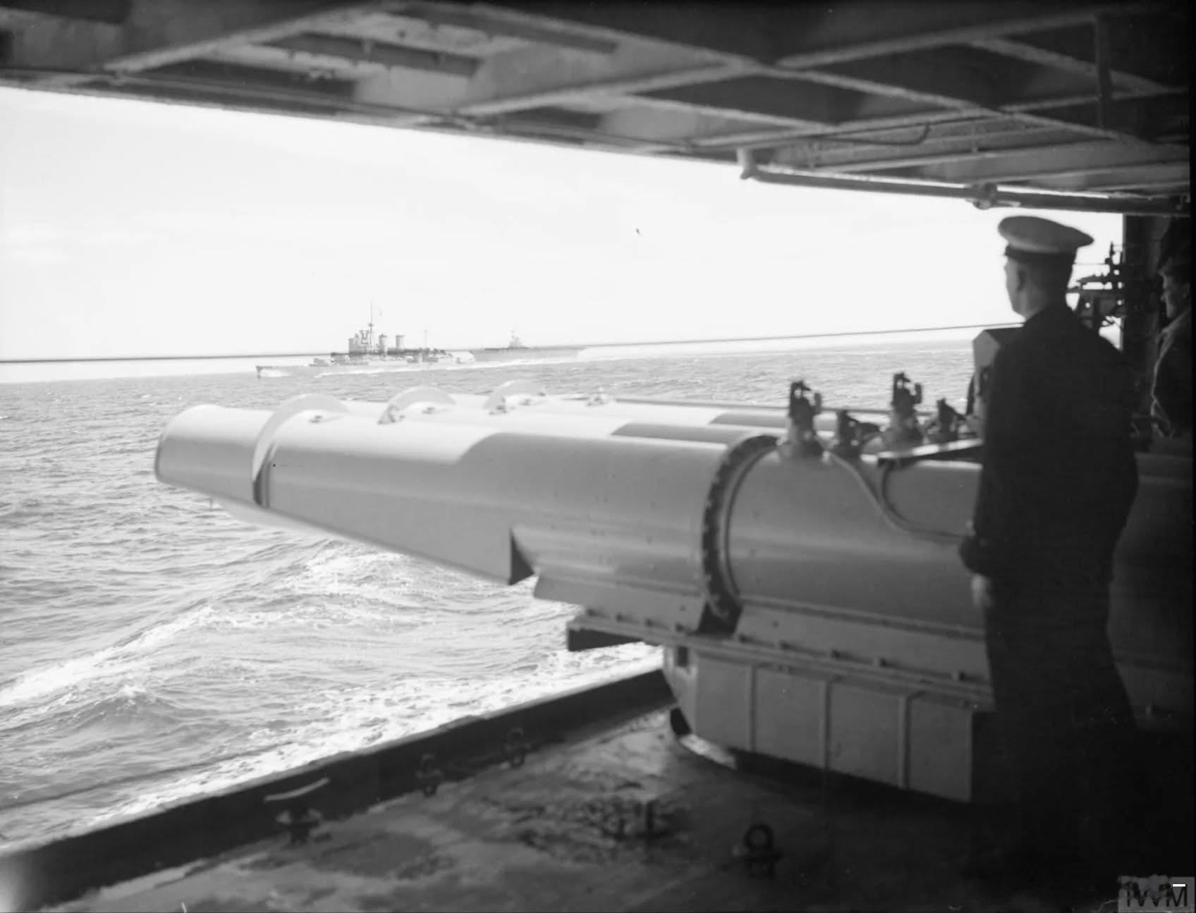 正在进行试航的皇家海军南安普顿号轻巡洋舰(图1)摄于1936年12月;图2则是谢菲尔德号轻巡洋舰上的533mm鱼雷发射管,从开口看出去可以看到远处的声望号战列巡洋舰和皇家方舟号航母,摄于1941年。城级轻巡洋舰及其改进型称为二战期间皇家海军轻巡洋舰的中坚力量,参加多次重大海战并履立战功军事历史全触达中外舰闻每天认识一件兵器