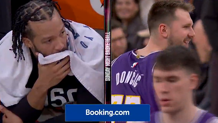 东契奇撤步三分投进拿到14分,随后和替补席布伦森微笑互动
