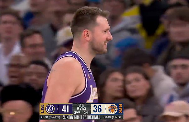 第二节比赛中,东契奇撤步三分投进拿到14分,随后和替补席布伦森微笑互动。