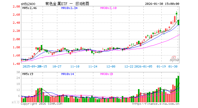 1月30日,有色金属ETF(512400)跌9.87%,成交额62.56亿元。当日份额增加4.24亿份,最新份额为188.85亿份,近20个交易日份额增加81.97亿份。最新资产净值计算值为448.07亿元。