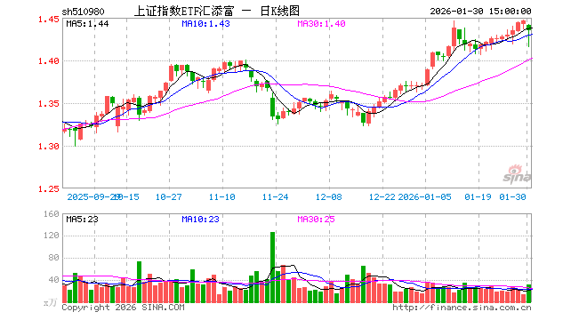 1月30日,上证指数ETF汇添富(510980)跌0.76%,成交额4612.47万元。当日份额增加1200.00万份,最新份额为2.43亿份,近20个交易日份额减少4500.00万份。最新资产净值计算值为3.47亿元。