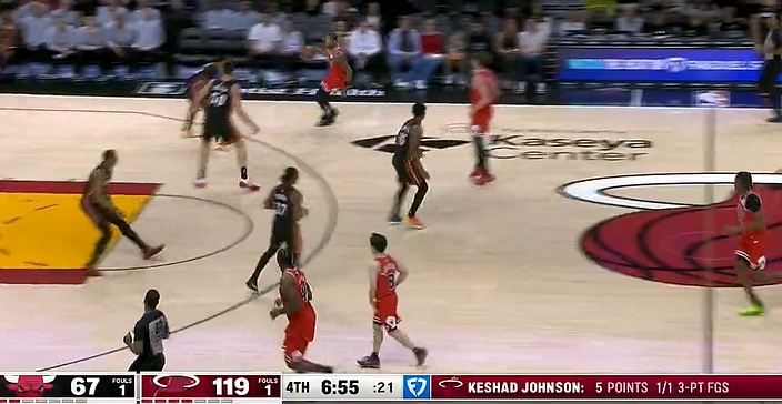比赛第四节,凯沙德-约翰逊三分命中,热火已领先公牛多达52分。