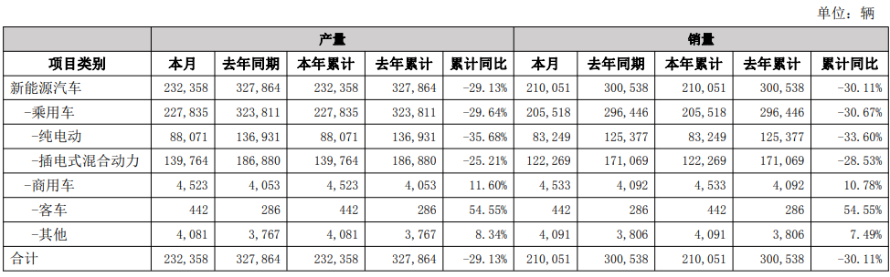 2月1日,比亚迪(002594/01211/81211)发布公告,2026年1月的产销快报显示,新能源汽车的产量为23万辆,同比下降29.13%;销量为21万辆,同比下降30.11%。