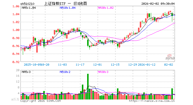 2月2日,上证指数ETF(510210)开盘跌0.77%,报1.026元。上证指数ETF(510210)重仓股方面,农业银行开盘涨0.15%,中国石油跌2.90%,贵州茅台涨1.71%,工业富联跌1.56%,中国银行涨0.00%,紫金矿业跌8.15%,中国神华跌0.67%,中国人寿跌1.53%,招商银行涨0.54%,中国平安跌0.60%。