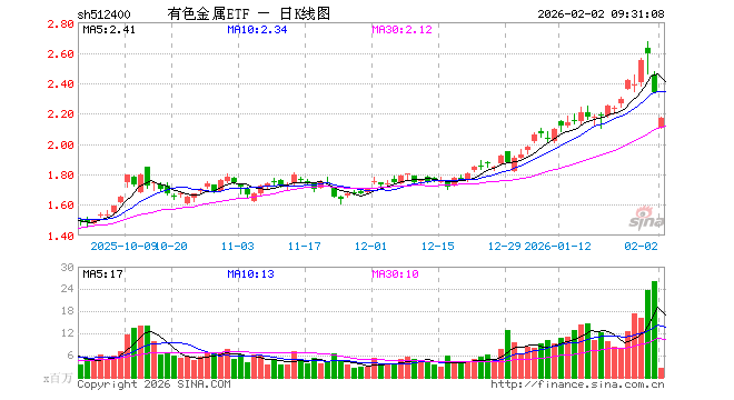 2月2日,有色金属ETF(512400)开盘跌10.00%,报2.105元。有色金属ETF(512400)重仓股方面,紫金矿业开盘跌8.15%,洛阳钼业跌9.99%,北方稀土跌4.98%,华友钴业跌4.39%,中国铝业跌7.93%,赣锋锂业跌1.78%,山东黄金跌9.99%,云铝股份跌4.88%,中金黄金跌10.00%,藏格矿业跌5.46%。