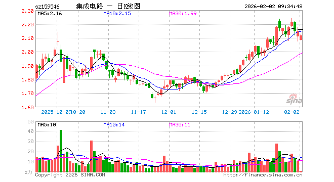 2月2日,集成电路ETF(159546)开盘跌3.02%,报2.084元。集成电路ETF(159546)重仓股方面,寒武纪开盘跌0.79%,中芯国际跌1.28%,海光信息跌1.68%,兆易创新跌4.47%,澜起科技跌0.47%,豪威集团跌0.51%,紫光国微跌1.22%,长电科技跌2.10%,芯原股份跌3.16%,通富微电跌2.88%。