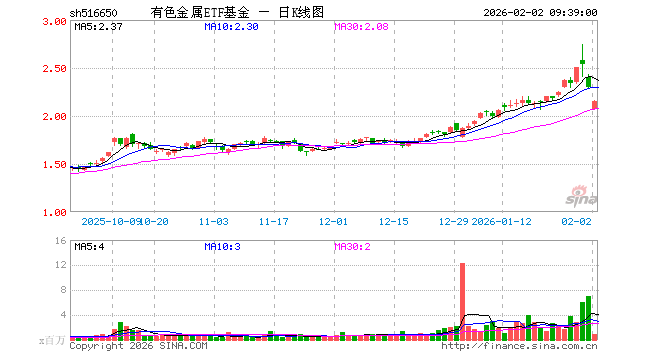 2月2日,有色金属ETF基金(516650)开盘跌9.98%,报2.066元。有色金属ETF基金(516650)重仓股方面,紫金矿业开盘跌8.15%,洛阳钼业跌9.99%,北方稀土跌4.98%,华友钴业跌4.39%,中国铝业跌7.93%,赣锋锂业跌1.78%,山东黄金跌9.99%,云铝股份跌4.88%,中金黄金跌10.00%,天齐锂业跌2.77%。