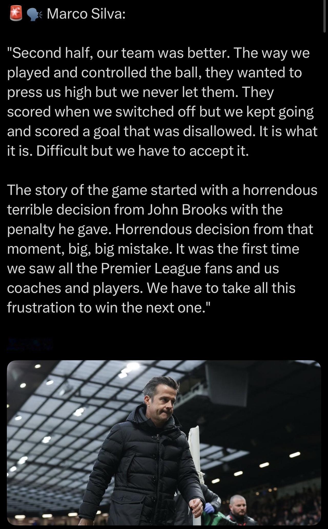 富勒姆的成功,在于踢的直接。 第二个进球,要是给曼城和阿森纳,估计那个时候还在倒脚,想往禁区里做球,结果他们直接射门了[捂脸]。 曼联踢惯了对手的磨叽,最近10年就一直难赢这种和自己一样,简单粗暴型选手。 ……………………………………………………………… 席尔瓦: “下半场我们队表现更好。我们踢得更好,控球也更好,他们想对我们进行高位逼抢,但我们始终没有让他们得逞。他们趁我们注意力不集中的时候进球了,但我们没有放弃,还打进了一个被判无效的进球。这就是比赛。虽然很难接受,但我们必须接受。” 比赛的故事始于约翰·布鲁克斯判罚的那个糟糕透顶的点球。从那一刻起,那就是一个可怕的决定,一个巨大的错误。那是我们第一次见到所有英超球迷,还有我们教练和球员。我们必须把所有的沮丧都转化为动力,赢得下一场比赛。