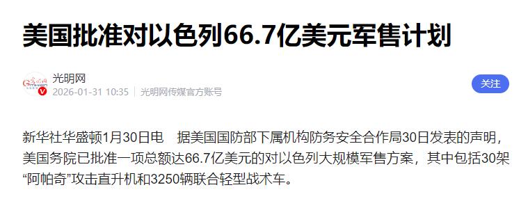 果然被我猜中了,1月31日,美国国务院正式拍板,批准向以色列出售总价约66.7亿美元的军事装备,核心就是30架AH-64E“阿帕奇”攻击直升机和3250辆联合轻型战术车辆,另外还搭着装甲运兵车动力包和轻型多用途直升机。这波操作,明眼人一看就懂,熟悉的配方从来没变过。 瞧瞧这操作,多熟悉的味道。,还记得去年那会儿,国会山为了军援的事儿吵得面红耳赤吗?民主党嚷嚷着要加人权条件,说什么得兼顾地区民生,不能一味卖武器。 结果共和党铁了心要站以色列,一顿博弈下来,所谓的“人权附加条件”终究成了摆拍,到最后还是顺着美国一贯的思路,把大规模军售的绿灯彻底打开。 其实,大家心里都清楚,两党那点争吵,从来不是真的为了地区和平,无非是各自的政治算计罢了——民主党要讨好自家选民基本盘,共和党要绑定以色列和军工复合体,吵来吵去,最终都会落到“维护美国利益”这个核心上。 先说说这次军售的核心装备,每一样都藏着明确的用途,绝非单纯的“常规补给”,根据美国国防部下属防务安全合作局的声明,30架AH-64E“阿帕奇”攻击直升机占了大头,光这一项就价值38亿美元,剩下的3250辆联合轻型战术车价值19.8亿美元,再加上装甲运兵车动力包和轻型多用途直升机,刚好凑够66.7亿美元的总额。 可能有人对“阿帕奇”没概念,这款直升机可是美军的明星装备,也是以色列早就想要的“杀器”——它的飞行速度比老款快不少,燃油效率更高,能在战场上空停留更久牵制敌人,还能和MQ-1C“灰鹰”等无人机联动,60%的直接交火都能实现空地协同,不管是针对地面目标还是低空突袭,都能发挥不小的作用。 对以色列来说,这笔军售相当于给它的军事优势“加码”。要知道,以色列在中东本来就握着绝对的军事主动权,这次添了“阿帕奇”和大量战术车辆,无疑是进一步巩固对约旦河西岸、加沙地带,乃至周边黎巴嫩、叙利亚等地区的控制能力。 美国嘴上说,军售是为了“增强以色列应对当前和未来威胁的能力”,帮它保卫边境和重要基础设施,说白了就是要把以色列打造成自己在中东的“军事桥头堡”,让它能替美国盯着中东的局势,牵制伊朗等美国眼中的“潜在对手”。 而美国的算盘,远比表面看起来更精,首先最直接的就是帮本国军工产业赚大钱——军工复合体是美国的重要利益群体,大规模军售从来都是军工企业的“摇钱树”,这笔66.7亿美元的订单,能让波音等巨头赚得盆满钵满,而军工企业反过来又会给两党提供政治献金,形成一个循环。 其次,美国想通过军事捆绑,继续牢牢掌控中东的主导权,毕竟以色列是美国在中东最核心的盟友,把先进武器卖给它,既能绑定双方的利益,又能让以色列更依赖美国的装备体系,相当于把以色列牢牢拴在美国的战车上。 更值得注意的是,这次对以色列的军售,还和美国对沙特的90亿美元军售同步获批,表面上看是“一碗水端平”,实则是精准的战略布局。 中国现代国际关系研究院的专家就分析过,美国对以色列的军售,侧重强化其进攻能力,巩固军事霸权;对沙特的军售则侧重防空,看似是帮沙特提升防御,实则是让沙特的防空系统能顺带保护美国在中东的利益,甚至帮以色列拦截伊朗的导弹。 说到底,美国就是想通过武装不同的盟友,让它们各自分工,共同维护美国在中东的利益,同时分担美国的防务压力。 可能有人会问,美国就不怕加剧中东的紧张局势吗?答案是,它根本不在乎,对美国来说,中东越乱,它越有理由介入,越能维持自己的影响力。 要知道,当前中东局势本就严峻,美伊之间的军事冲突隐患不断,这次大规模军售,必然会刺激伊朗的安全焦虑,倒逼伊朗强化自身军事能力,进而引发地区军备竞赛,更关键的是以色列本身对巴勒斯坦就持强硬立场,有了更先进的武器,只会更依赖军事手段解决矛盾,这对本就艰难的巴以和平进程来说,无疑是雪上加霜。 说到底,这次美国批准对以色列的大规模军售,从来不是什么“盟友互助”,而是一场精准的利益交换——美国赚军工利润、稳中东霸权,以色列获先进装备、固地区优势,唯独受伤的是中东的普通民众,是本就脆弱的地区和平。 这种“以武谋霸”的操作,美国已经玩了很多年,从欧洲到中东,只要哪里有利益可图,哪里就有美国军售的身影,只是美国忘了,霸权手段终究无法换来真正的安全,一味地贩卖武器、激化矛盾,最终只会反噬自身,而中东地区的和平与稳定,从来都不是靠堆砌武器就能实现的。