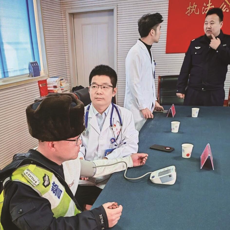 1月27日,活动首站走进邯郸市交巡警复兴一大队,院团委书记郭华带领由复兴院区党总支书记贺靖澜、心血管内三科主任李鹤飞、神经病学中心副主任杨直堂、全科医学科副主任赵文静、皮肤科医师韩建辉等组成的专家团队,为常年奋战在一线的交巡警们送去健康关怀与义诊服务,以实际行动致敬这些城市守护者。