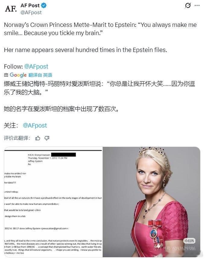 欧美名流集体否认涉爱泼斯坦案挪威王储妃梅特﹣玛丽特对爱泼斯坦说:"你总是让我开怀大笑……因为你逗乐了我的大脑。"