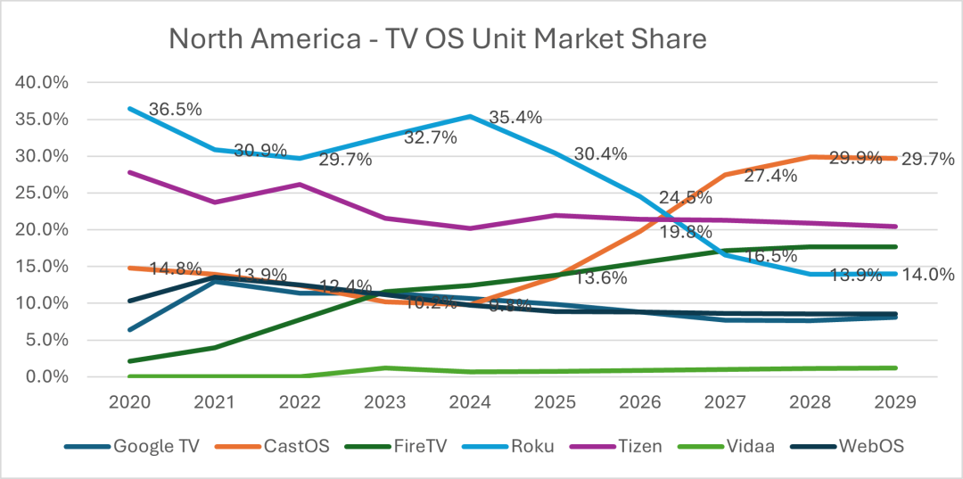 Omdia预测,到2027年北美市场将出现转折点,届时搭载沃尔玛CastOS设备的出货量将达到1,400万台。这一增长受益于沃尔玛收购Vizio及其CastOS平台的扩展。在收购Vizio之后,沃尔玛迅速将Vizio出货量从2024年的480万台提升至2025年预计的660万台,增幅为37.5%。同时,亚马逊将FireTV出货量从2024年的610万台提升至2025年预计的680万台,增幅为11.5%。