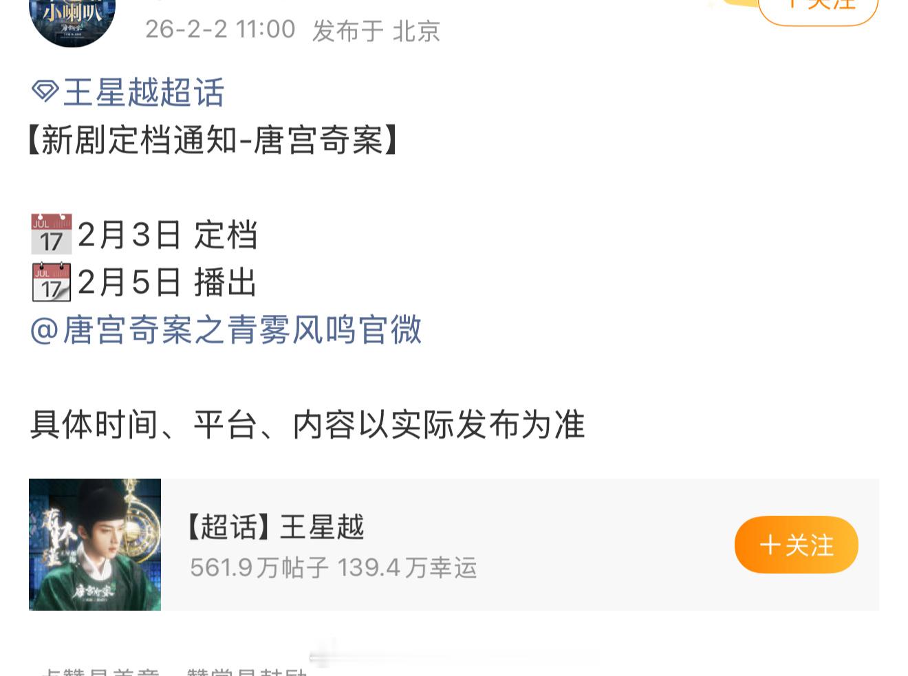 白鹿、王星越《唐宫奇案之青雾风鸣》明天定档,5号播出,燥候之!!