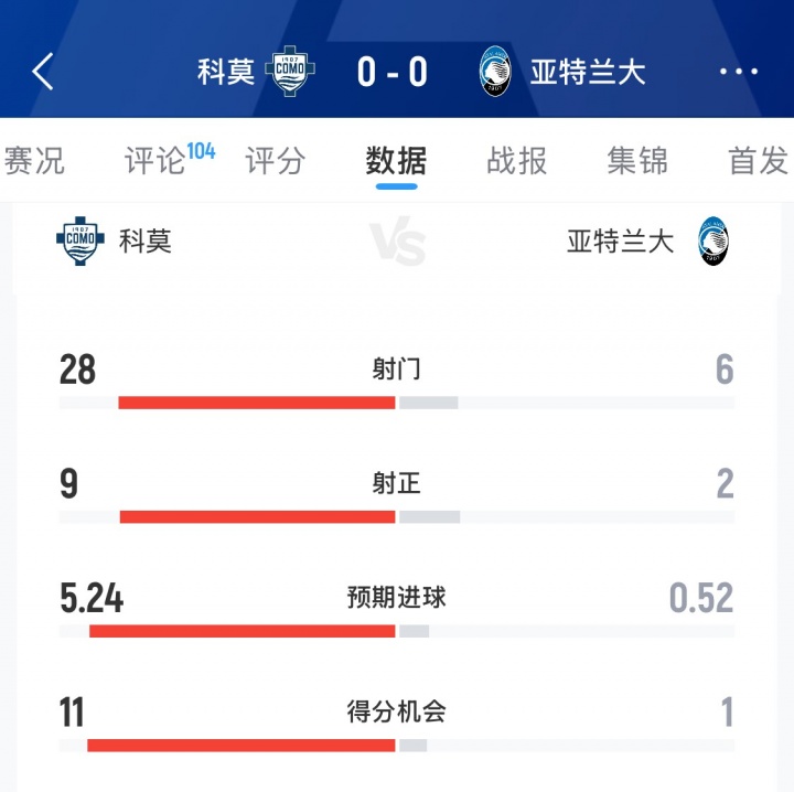 直播吧02月02日讯意甲第23轮,科莫主场0-0战平亚特兰大,本场比赛科莫预期进球高达5.24,而亚特兰大的预期进球为0.52。