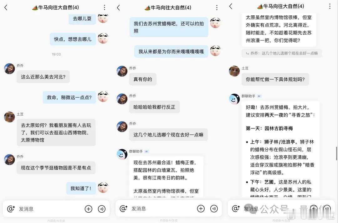 但建一个文心群聊,当大家讨论“这个季节哪儿人少景好”“怎么走不绕路”时,不用你手动群中还为每位成员配备了专属的个人文心助手Agent,它能记住你的个人偏好,担任你的随行助理。也就是说,大家的讨论会在多个Agent的实时补充与协作下,得以快速聚焦,形成可行方案。
