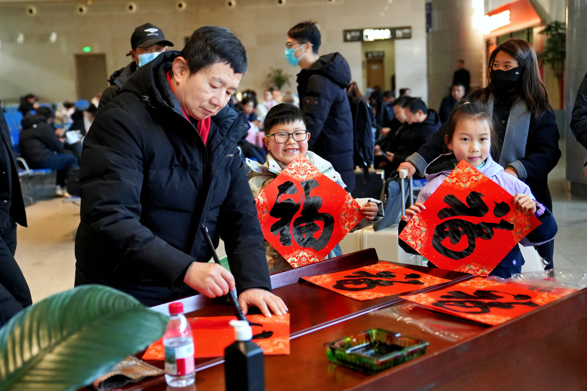 春运首日,信阳车站联合信阳市书法家协会开展“万福添年味”活动,让归乡旅途更具年味儿。活动现场,悠扬的古筝声萦绕耳畔,偶尔有快闪舞蹈与民族舞蹈的灵动片段穿插其间,书法家们挥毫泼墨,“平安春运伴君行”“龙马精神启新程”等吉祥联语与红火福字接连成型,被一一送到旅客手中。“拿到手写的福字特别惊喜,感觉年味儿一下就浓了,带着这份祝福回家,心里暖洋洋的。”准备返回安徽过年的张先生小心翼翼地收好福字。