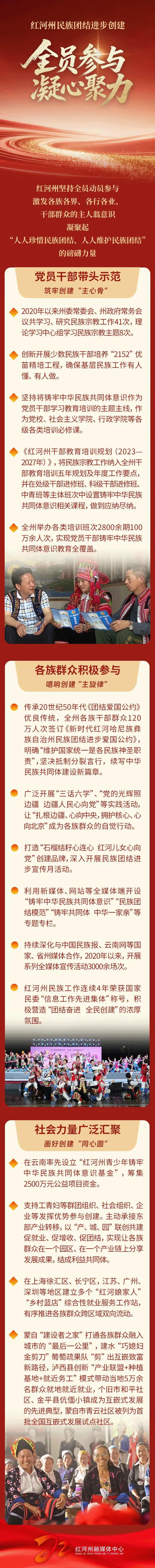 日前,云南省红河哈尼族彝族自治州被国家民族事务委员会命名为“全国民族团结进步示范区”。“云南红河发布”微信公众号将推出系列海报,为您解读红河州如何举全州之力,全面深化民族团结进步示范创建,探索边疆民族地区治理新路径。今天推出《全员参与凝心聚力》。