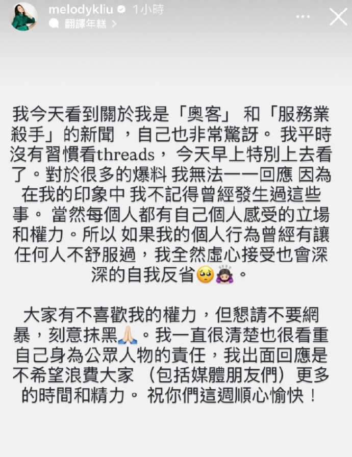 melody否认对服务人员态度不好melody让网友不要刻意抹黑 melody在社媒发文回应对服务人员态度不好的爆料:“对于很多的爆料,我无法一一回应,因为在我的印象中,我不记得曾经发生过这些事”。