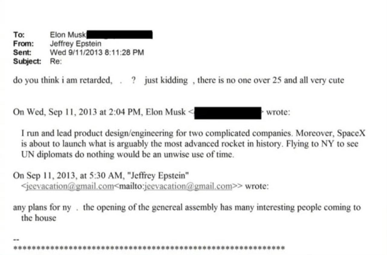 面对爱泼斯坦的邀请,马斯克说造火箭更有意思 马斯克承认了与爱泼斯坦的一封邮件的真实性,说其他的邮件都是假的。 邮件内容是爱泼斯坦邀请马斯克在纽约联合国大会期间参加一场“有意思”的家庭聚会,马斯克以嘲讽的语气称造火箭比参加(酒囊饭袋的)联合国官僚聚会有意思,拒绝了邀请。爱泼斯坦继续回复称:自己不傻,不会搞那种无聊的聚会,强调参加聚会的都不超过25岁。意思已经很明显了。邮件到此结束,没有显示马斯克是否继续回复。
