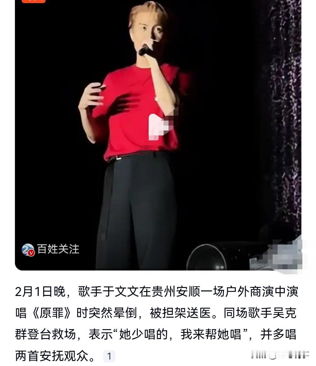 吴克群真是个好人。2月1日,于文文因身体不适晕倒送医。 吴克群帮忙救场,他说于文文少唱的,他帮她唱,多唱两首安抚观众。 并希望大家得到快乐安顺的一天。 他的回应也得到了很多观众的支持,很多人被他的话语打动,顿时开心了起来。 不得不说,吴克群的口碑还是可以的,经常听到他做好事的消息。