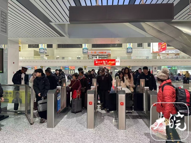 据介绍,春运首日,阜阳西站候车室客流较平日有所增长,旅客或有序检票,或闲谈等候,进站乘车更从容,出行体验更美好。