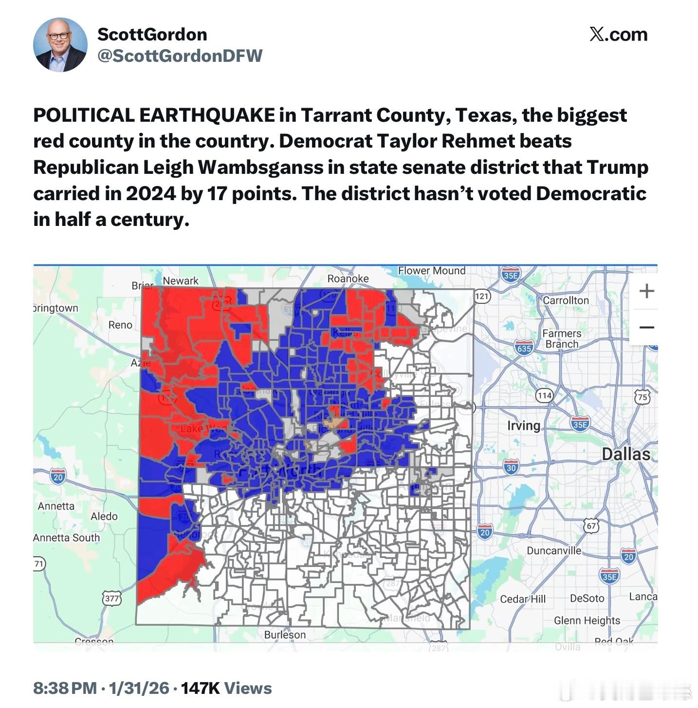 德州塔蘭特縣今晚發生政治地震,該縣是全美最大的共和黨票倉,然而民左黨候選人泰勒·雷赫梅特擊敗共和黨候選人莉·瓦姆斯甘斯,贏得州參議院席位。該選區在2024年曾被川普以17個百分點的優勢拿下,25年以來從未選出民左黨人。