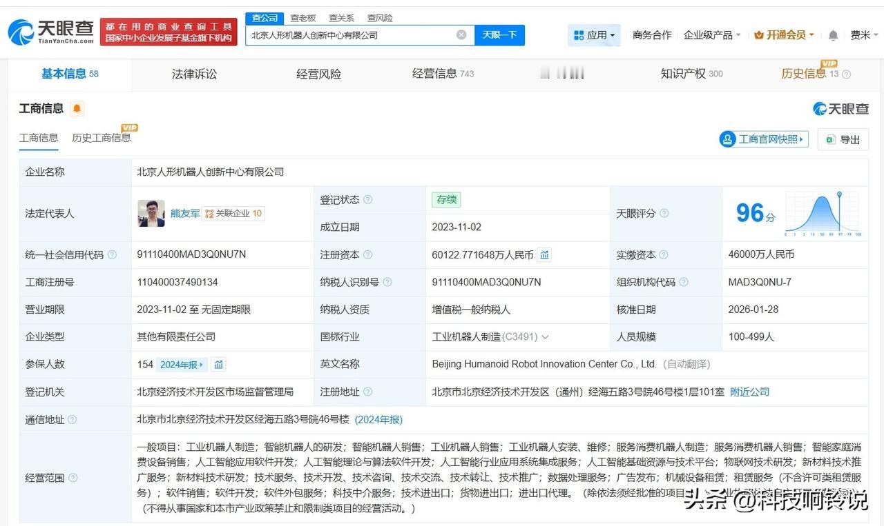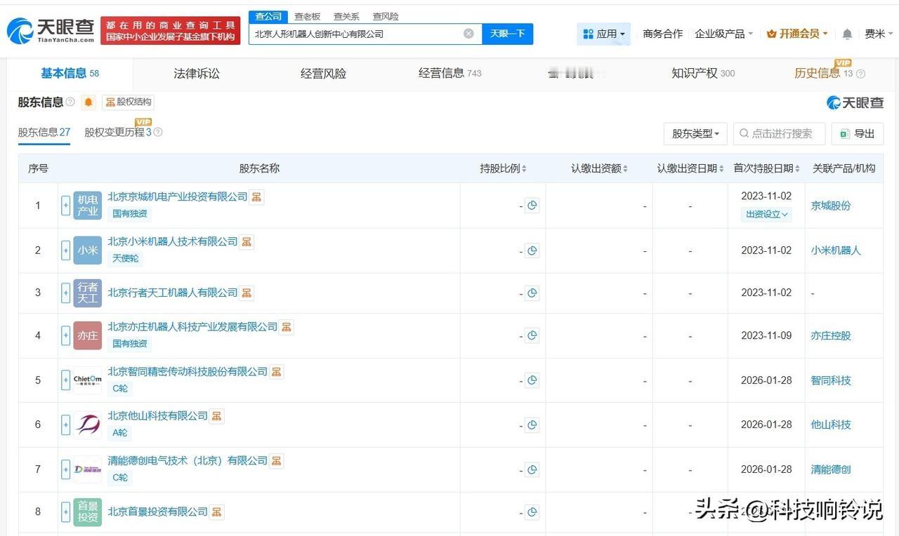 【百度等入股北京人形机器人创新中心 后者增资至约6亿】 天眼查App显示,近日,北京人形机器人创新中心有限公司发生工商变更,新增北京百度网讯科技有限公司、北京市人工智能产业投资基金(有限合伙)等为股东,同时,注册资本由4.6亿人民币增至约6亿。 北京人形机器人创新中心有限公司成立于2023年11月,法定代表人为熊友军,经营范围包括工业机器人制造、智能机器人的研发、智能机器人销售、工业机器人销售等。股东信息显示,该公司现由北京小米机器人技术有限公司、北京行者天工机器人有限公司及上述新增股东等共同持股。 天眼查信息: