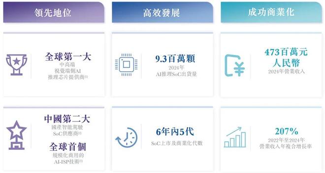 根据灼识咨询的数据,按2024年出货量计,爱芯元智是全球第一大中高端视觉端侧AI推理芯片提供商(市占率为24.1%)、全球第五大视觉端侧AI推理芯片提供商(市占率为6.8%)、中国第二大国产智能驾驶SoC供应商(售出超过51.8万颗智能汽车SoC)、中国第三大边缘AI推理芯片供应商(市占率为12.2%)。